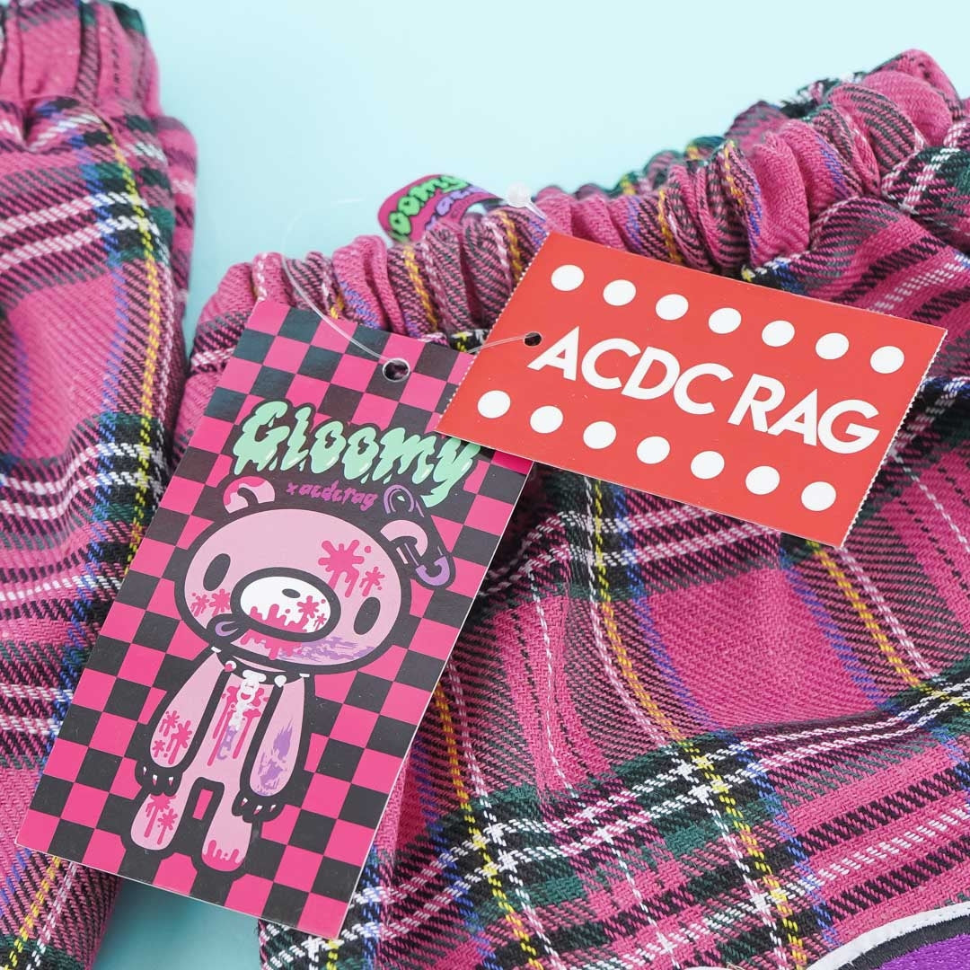 Add a major dose of cuteness to your outfit of the day with this super cute pair of checkered leg warmers! They feature a print of Gloomy Bear. ACDC Rag is a brand known for its Harajuku-style statement pieces. It is driven by a "No Borders" concept inspired by Takeshita-dori in Harajuku, Japan.