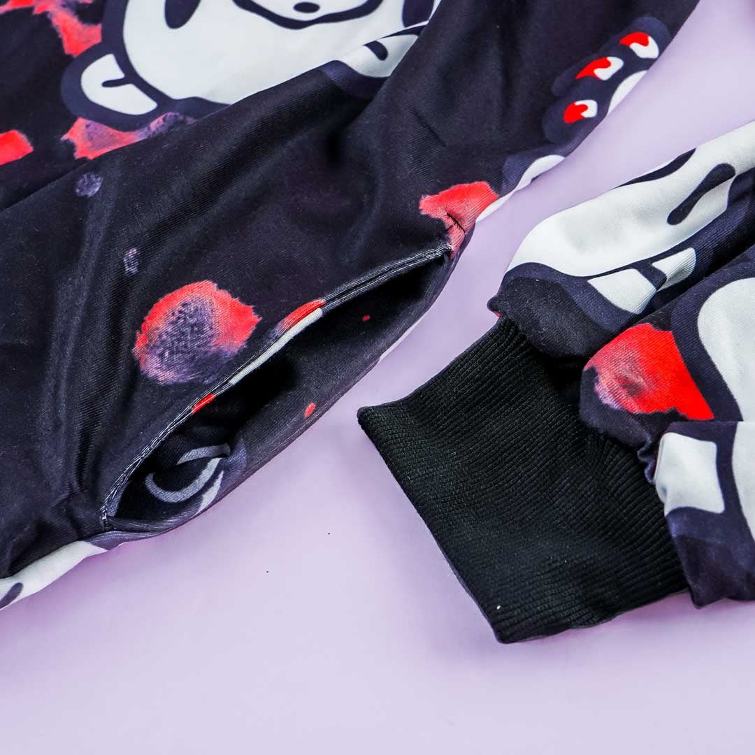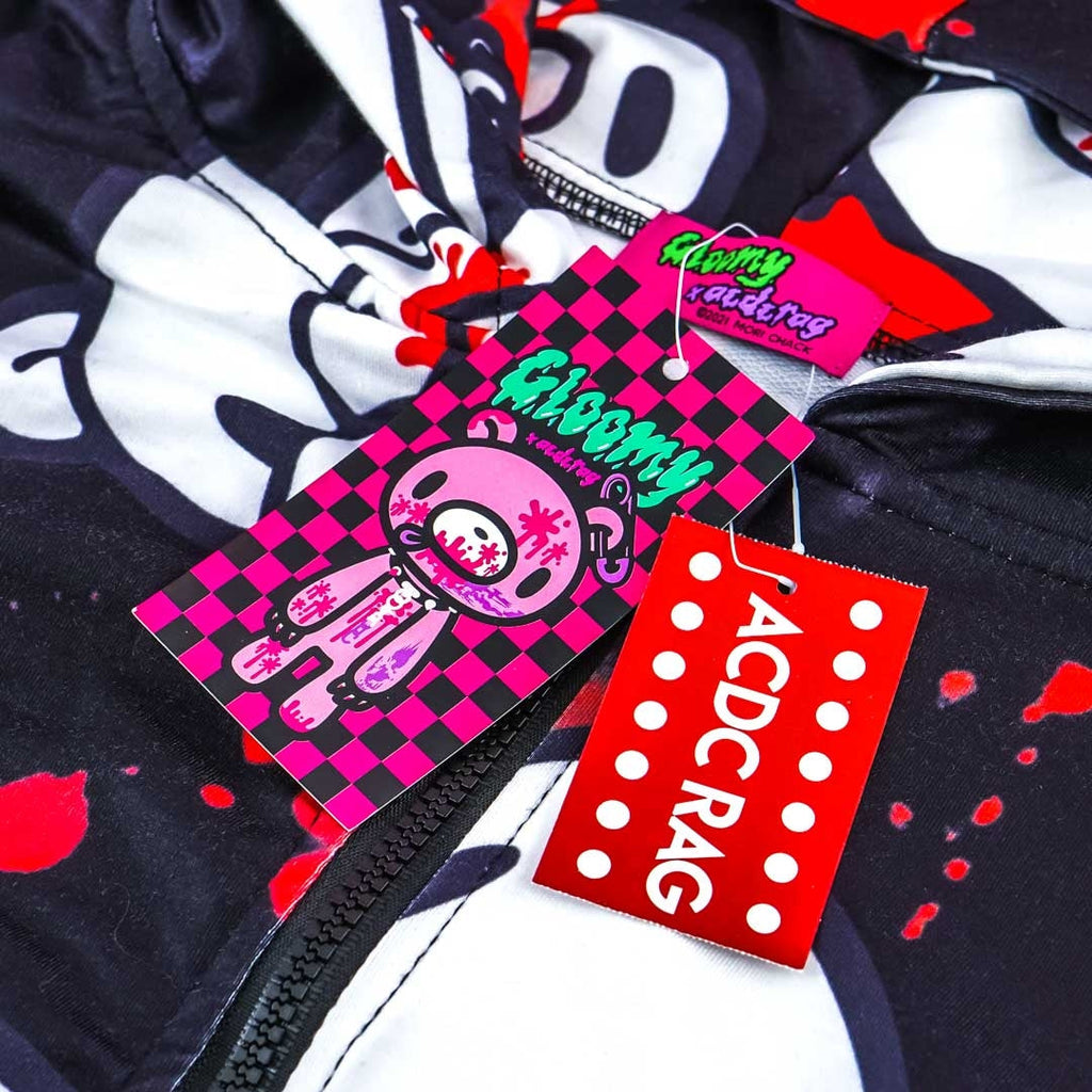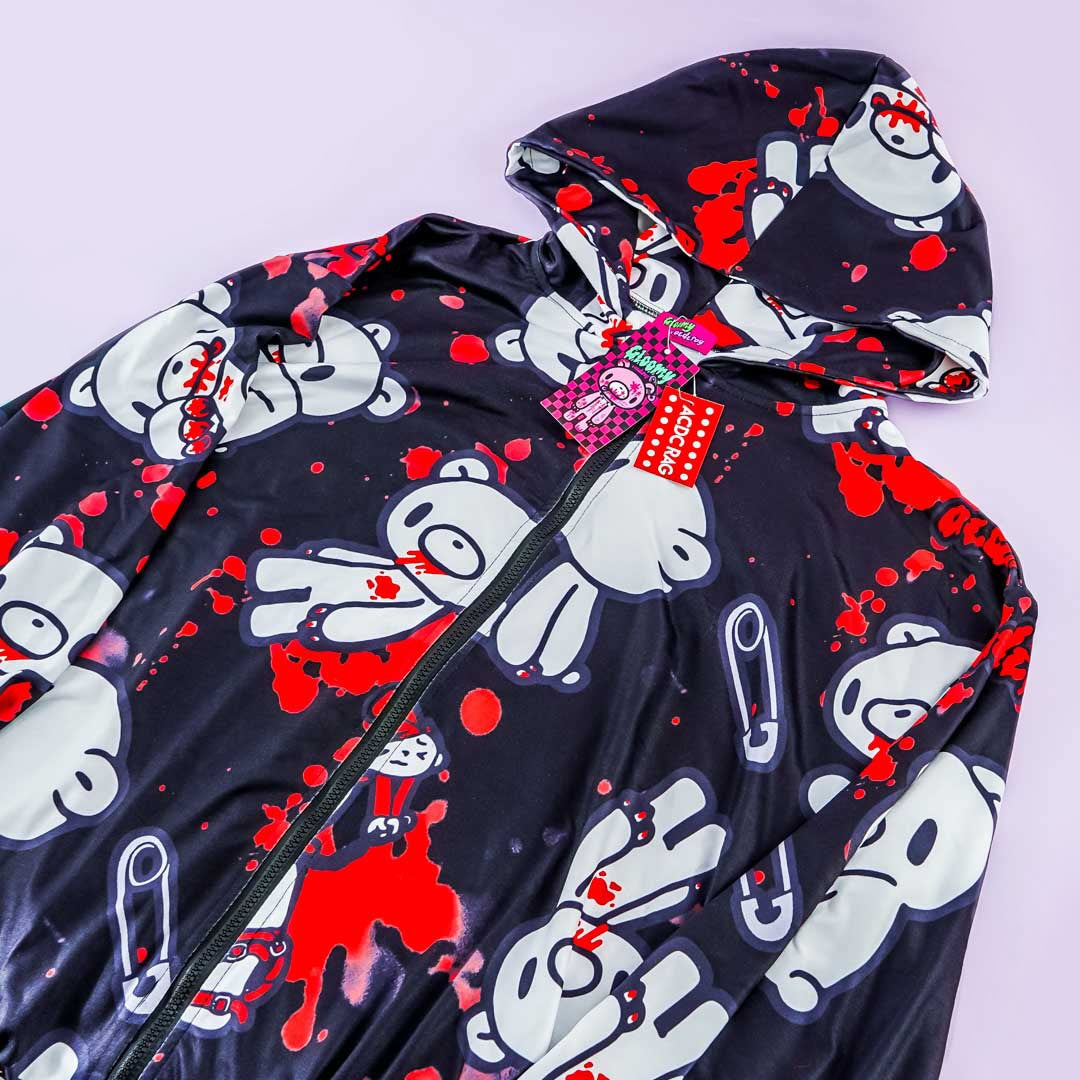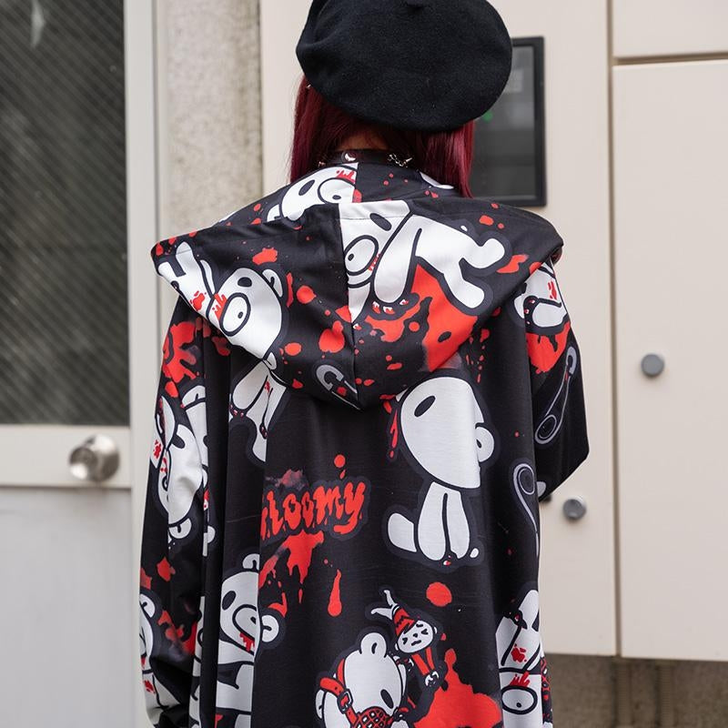 A kawaii Harujuku-style dark zippered hoodie featuring prints of Gloomy Bears and pins
