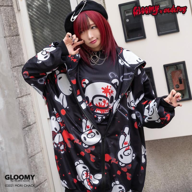This super kawaii zippered hoodie features prints of Gloomy Bears and pins! Put on this dark jacket to show off your love for Harajuku fashion. It comes from a Japanese clothing brand driven by a "No Borders" concept inspired by Takeshita-dori in Harajuku, Japan.