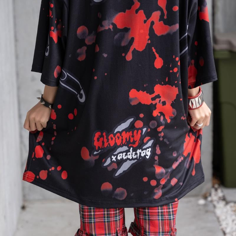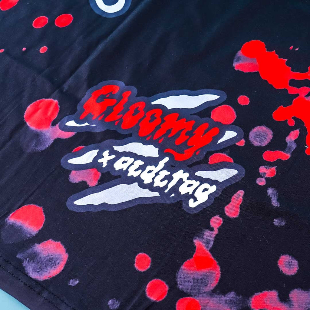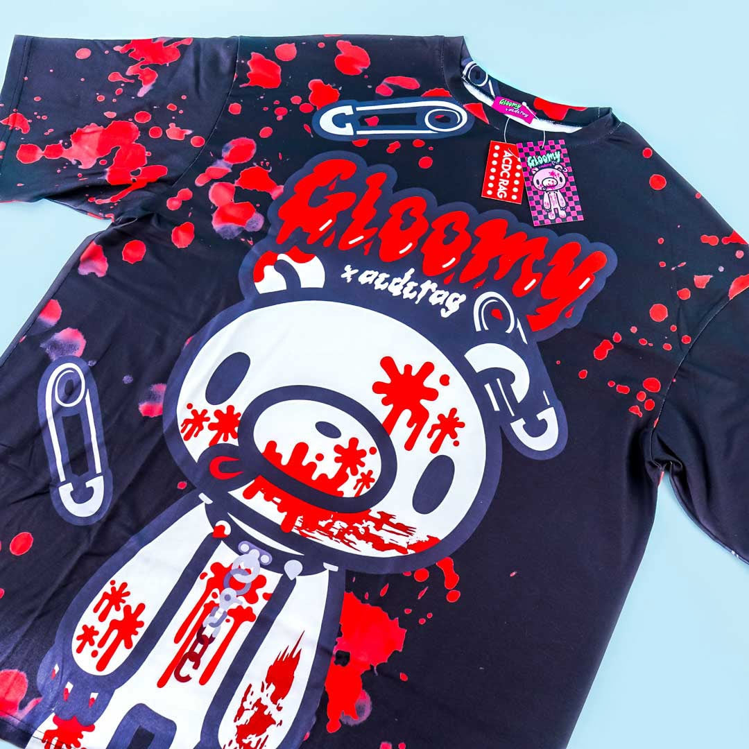 • An oversized with blood splatters shirt featuring a collaboration with Gloomy Bear