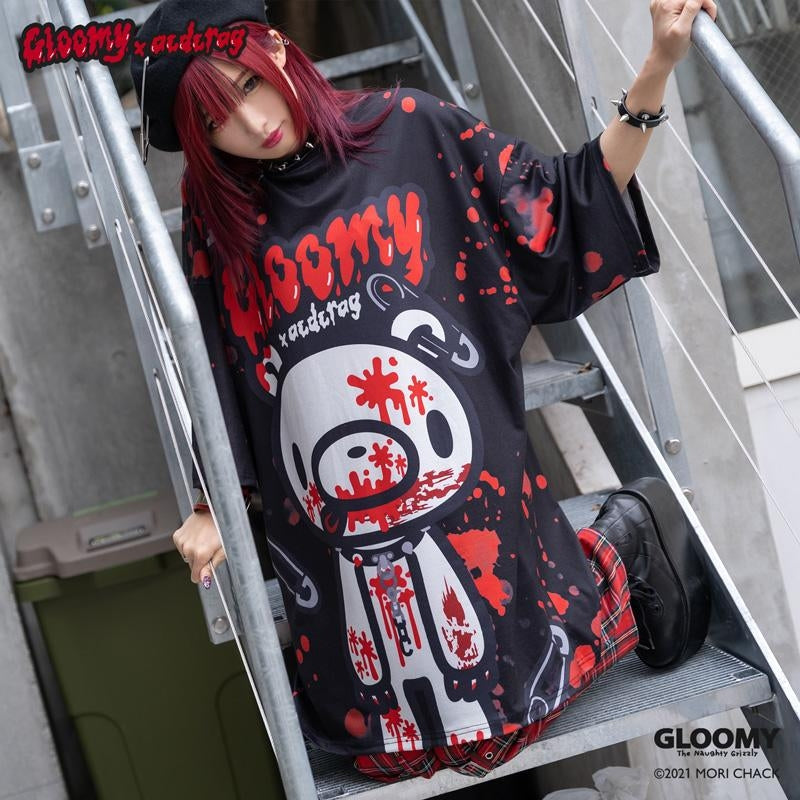 Make a statement with this oversized shirt from ACDC RAG that screams Harajuku punk style all over! This original brand based in Takeshita Dori is known for its unique kawaii designs. The huge shirt has an illustration of Gloomy Bear with lots of bright red blood splatters!