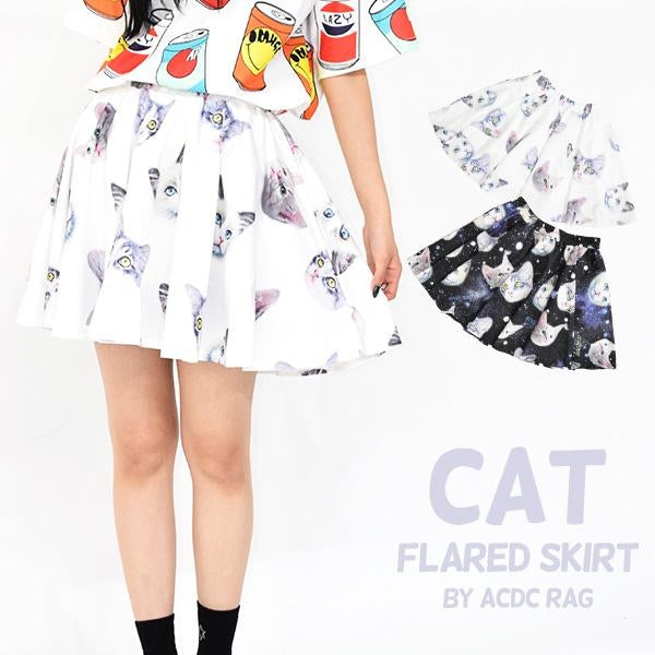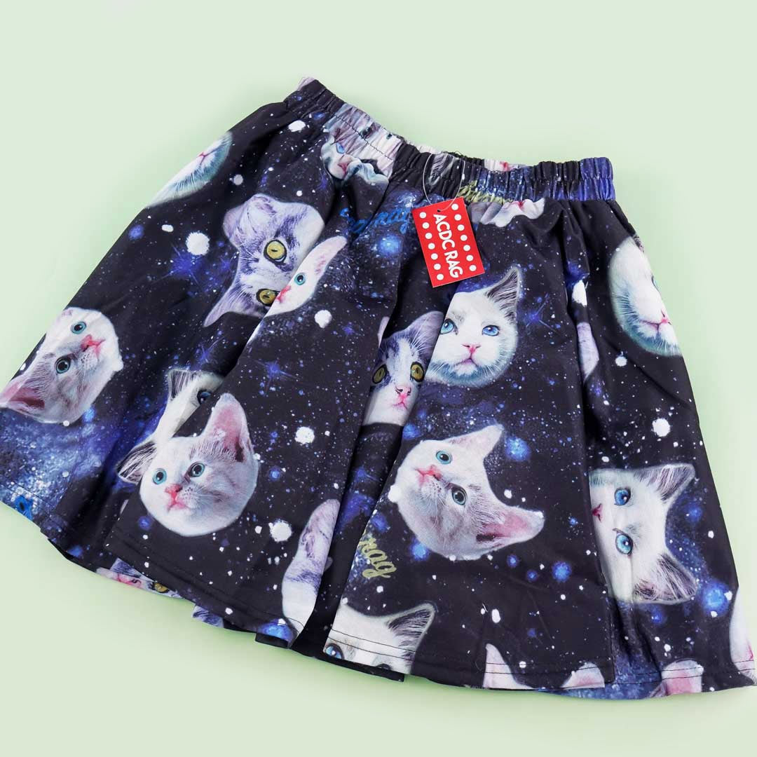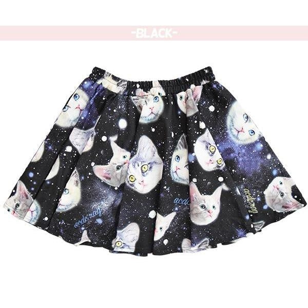 A kawaii Harajuku-style flare skirt illustrated with cats floating in space