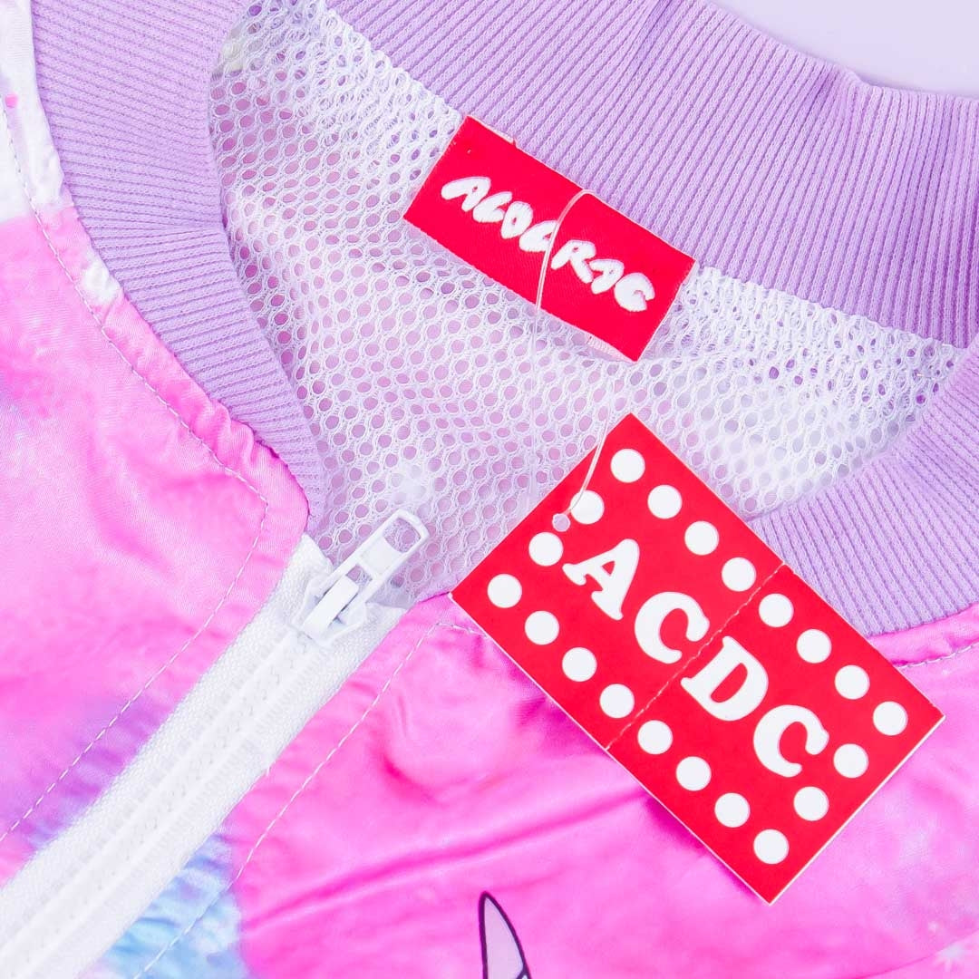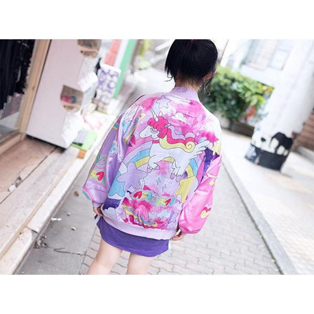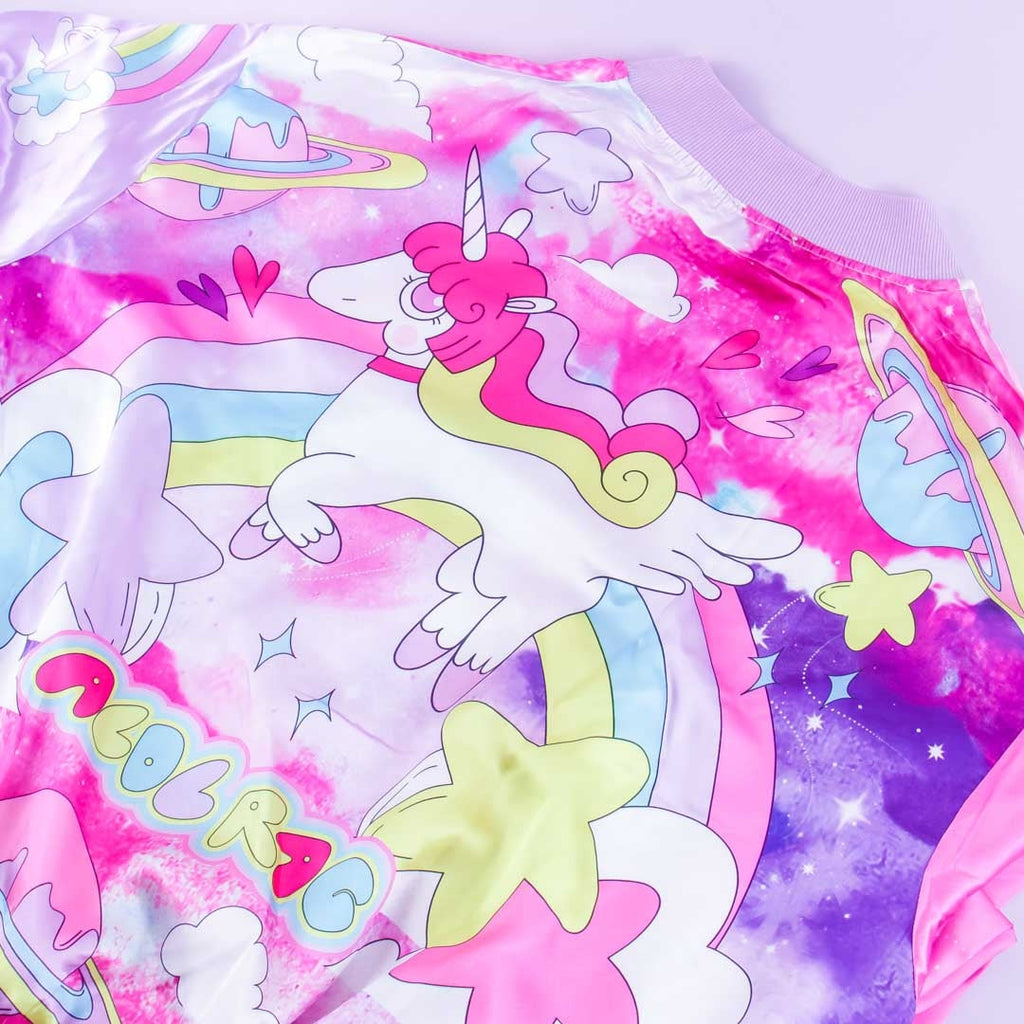 A cute zippered shiny jacket with illustrations of unicorns, rainbows, and planets