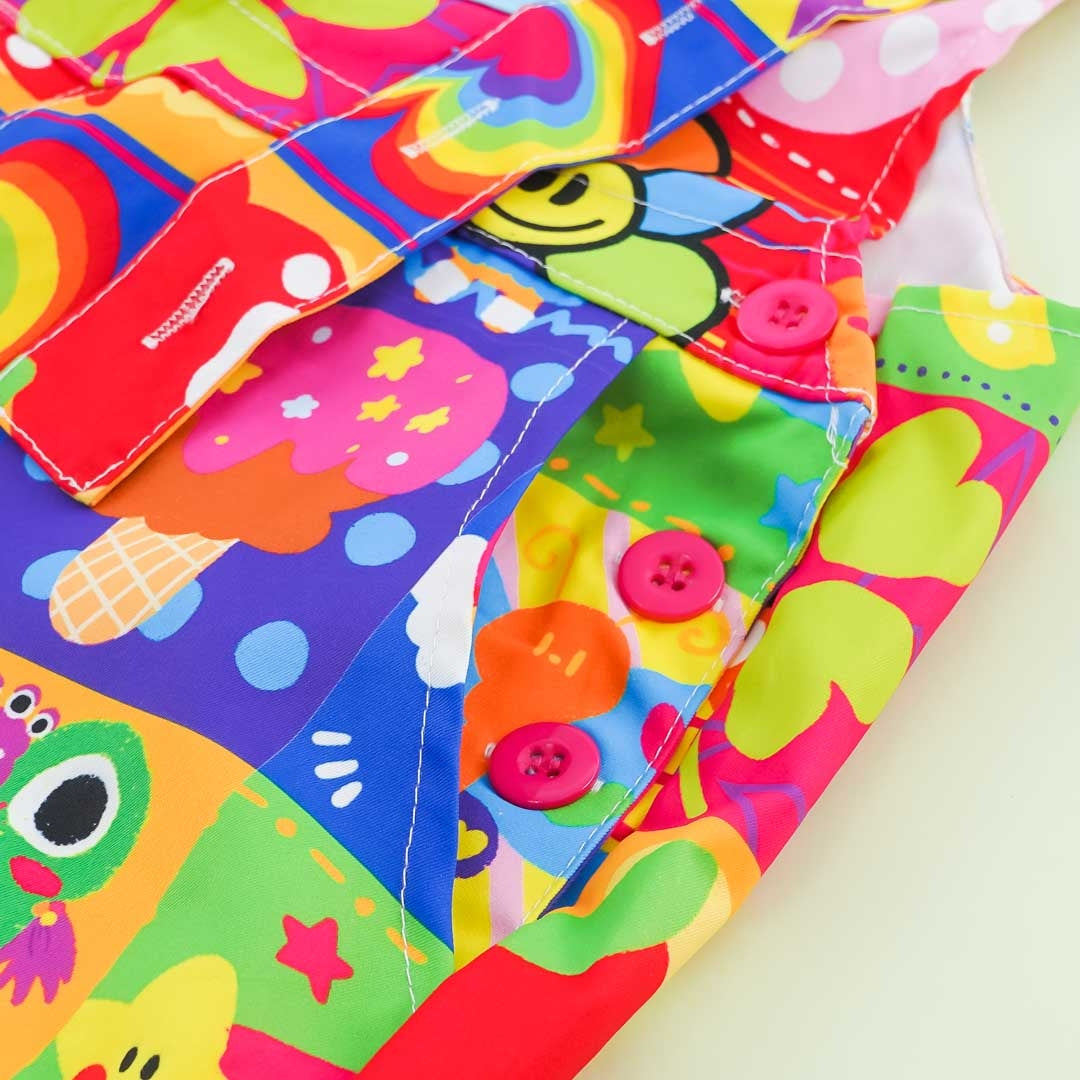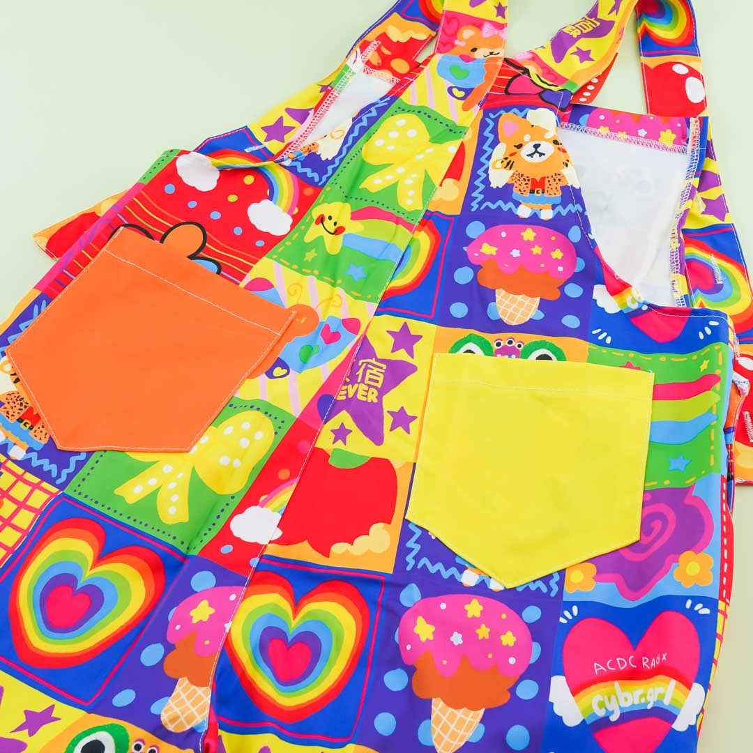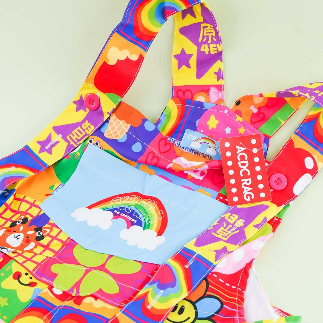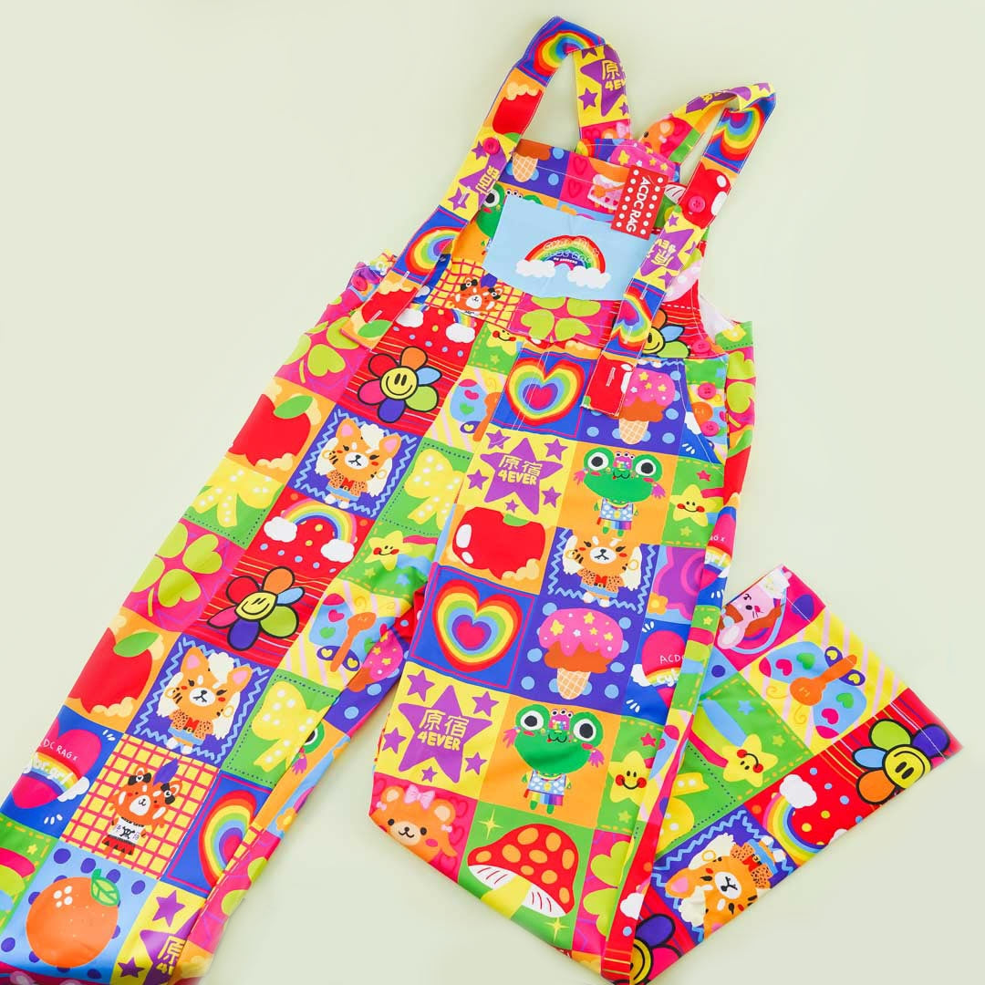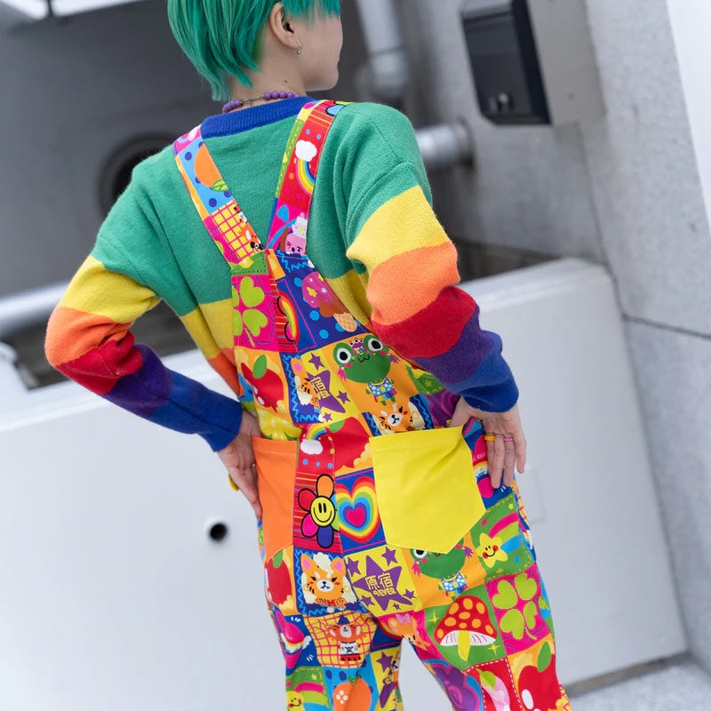 • A kawaii pair of overalls with lots of rainbow-colored doodles inspired by Harajuku culture