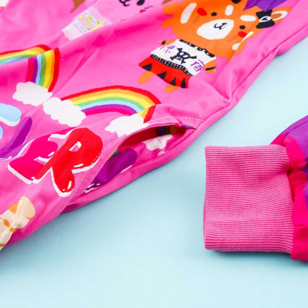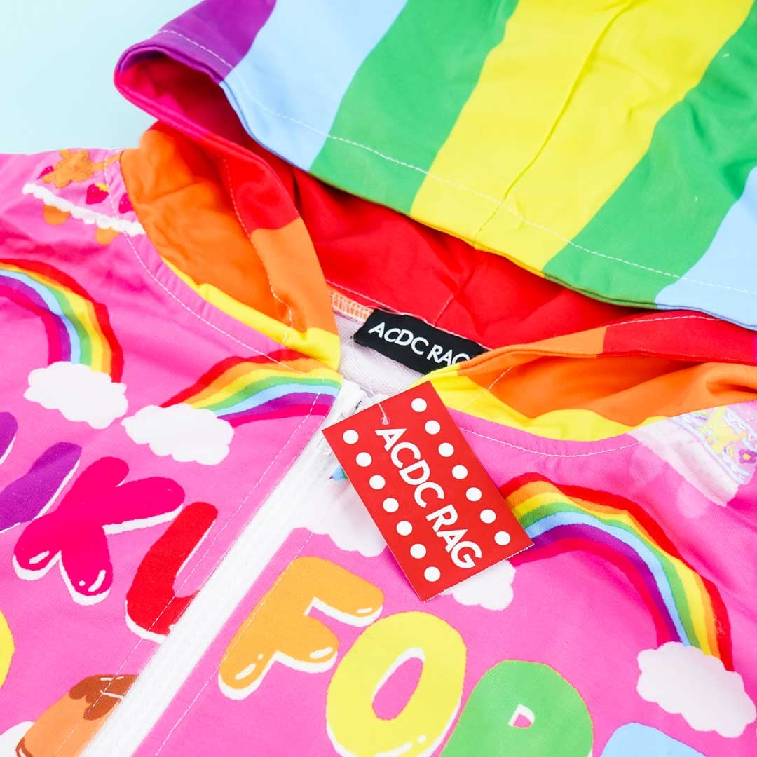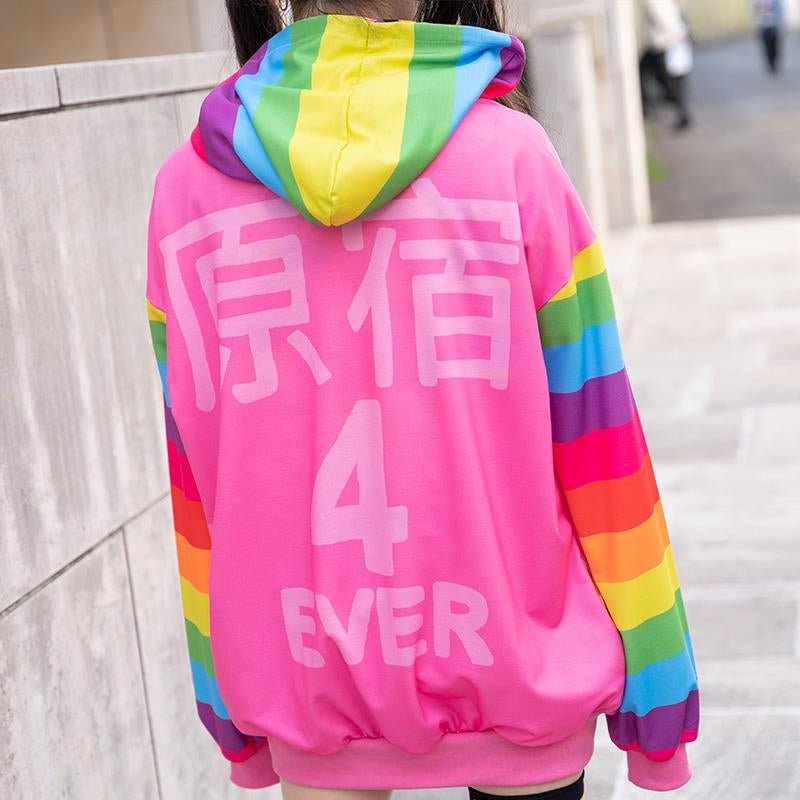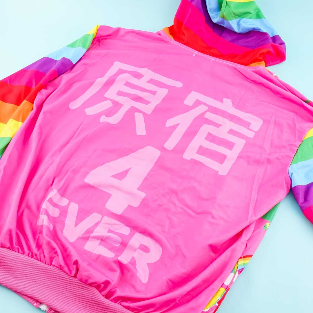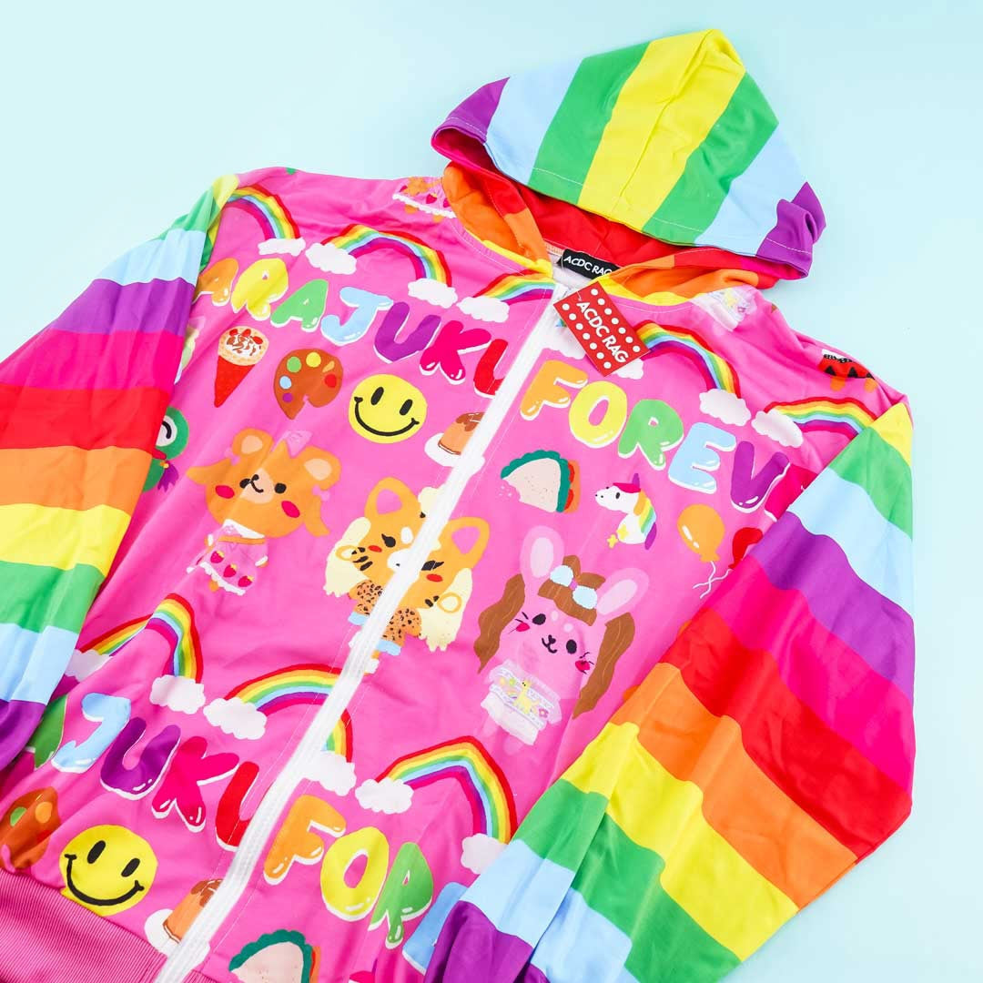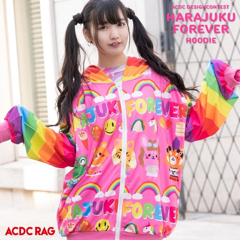 Keep yourself warm while looking kawaii by wearing this super cute jacket from ACDC RAG! It's a famous Harajuku fashion brand that is inspired by the colorful styles and sights seen at Takeshita Dori. This zippered hoodie has side pockets and is decorated with rainbow stripes, cute animals, and emojis! The backside of the jacket has a combination of kanji, letters, and numbers that spell out “Harajuku Forever!”