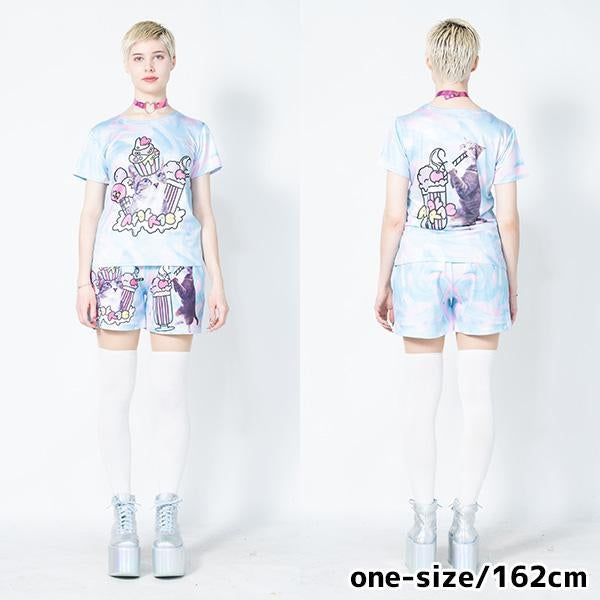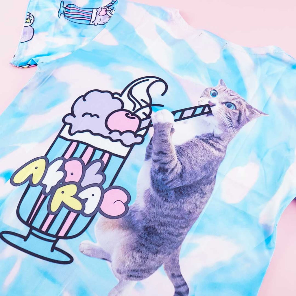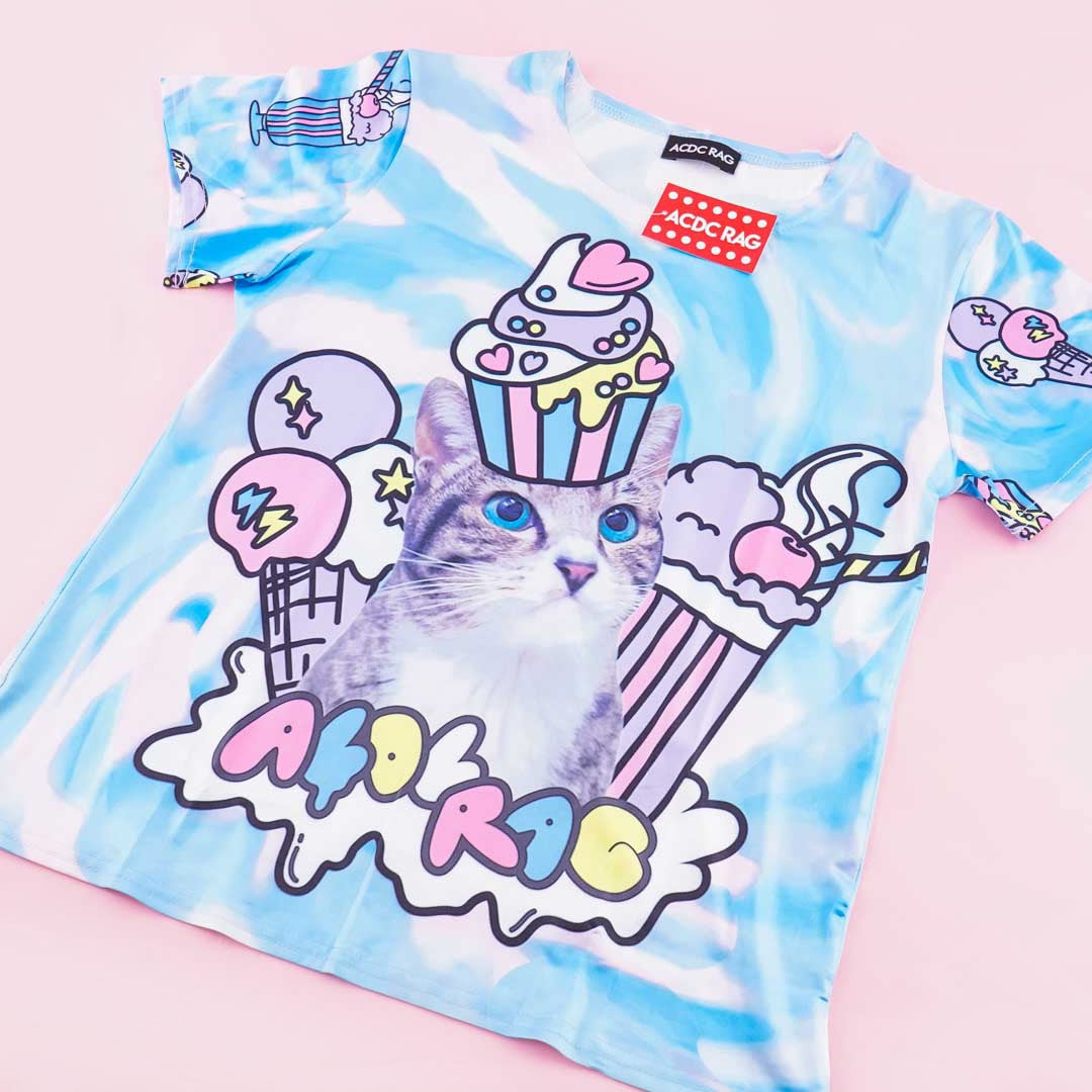 A kawaii fitted t-shirt featuring ACDC RAG’s Anji-kun the cat mascot and prints of desserts