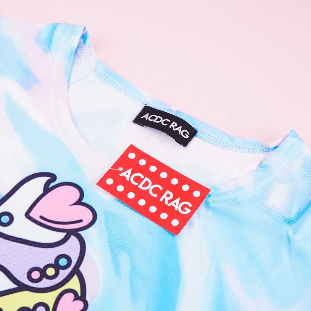 Make a statement with this cute shirt from ACDC RAG that screams kawaii style all over! This original brand based in Takeshita Dori in Harajuku is known for its unique kawaii designs. The fitted tee has a print of ACDC RAG’s cat mascot, Anji-kun with colorful drawings of cupcakes, ice cream, and milkshakes!