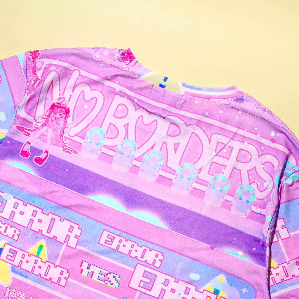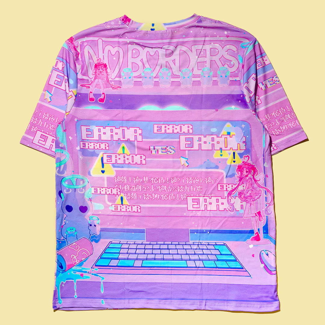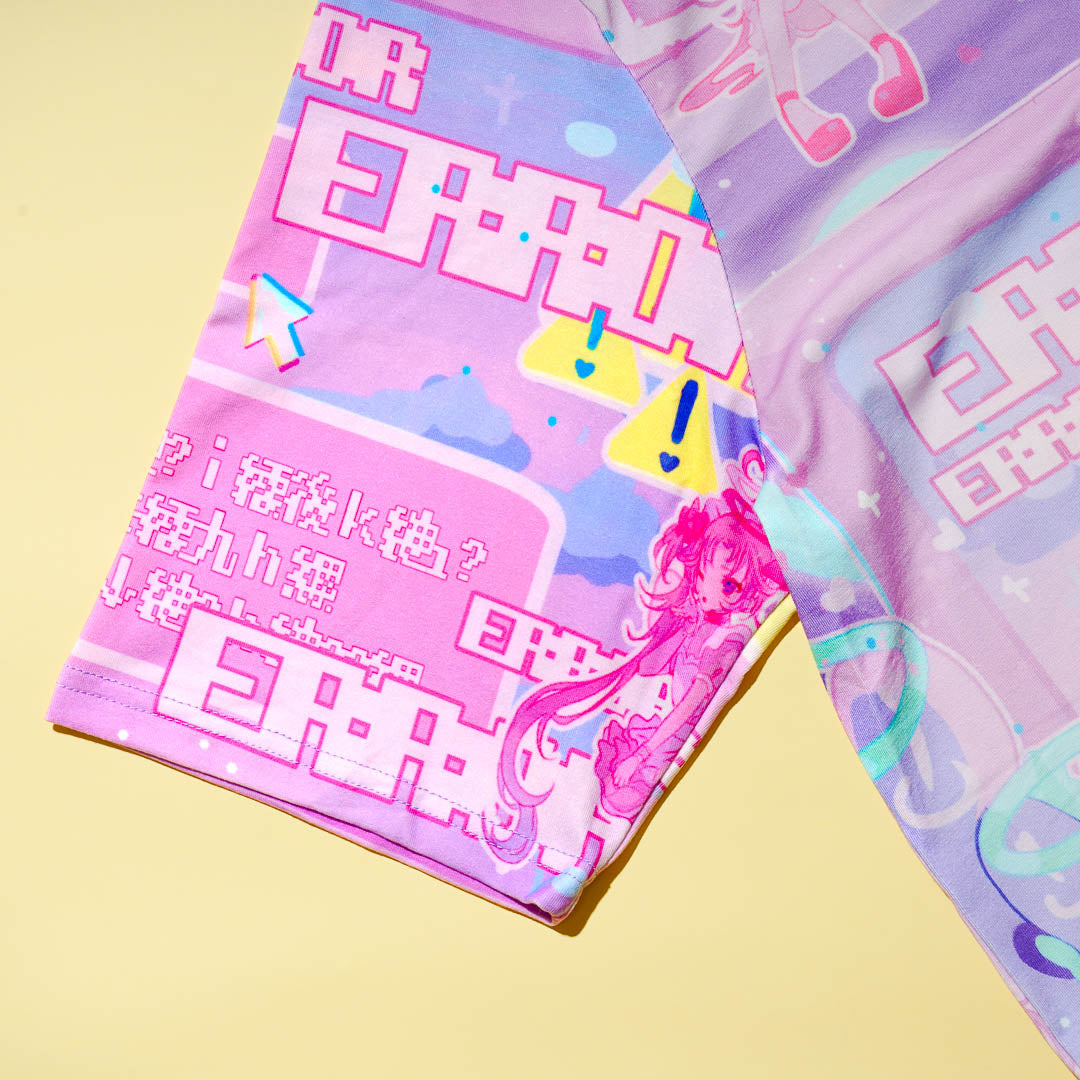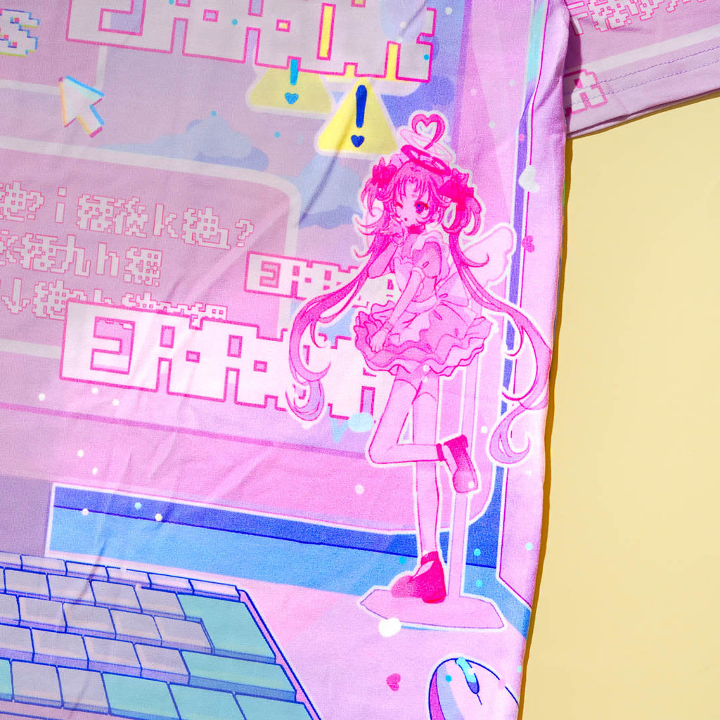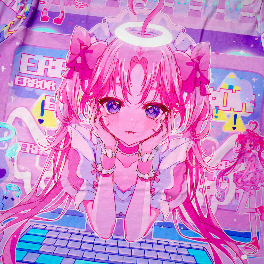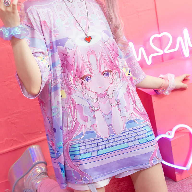 Show off your kawaii style when you wear this super cute oversized shirt! It features a flashy print of Idol Angel, a cute cyber anime girl designed by illustrator Peach Punch. This loose shirt can be worn by both men and women.