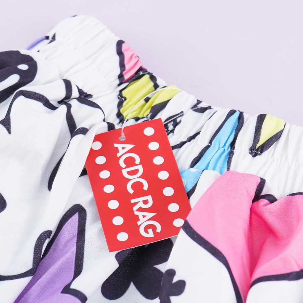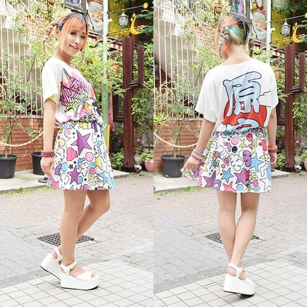 Add a flashy flared skirt from ACDC RAG to your outfit of the day! This knee-length polyester skirt is covered with illustrations of desserts and stars unique to Harajuku. It has a white base that is very easy to pair with any top you like!