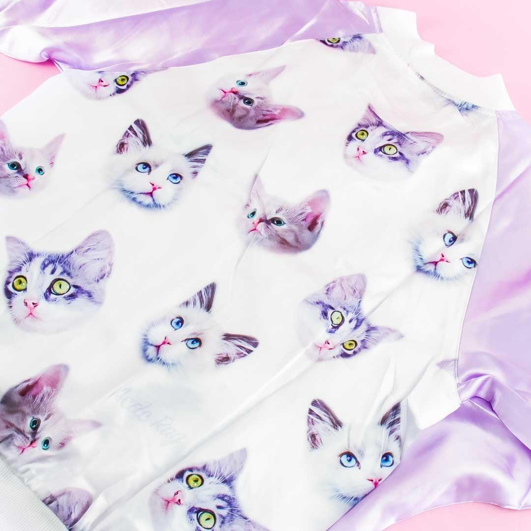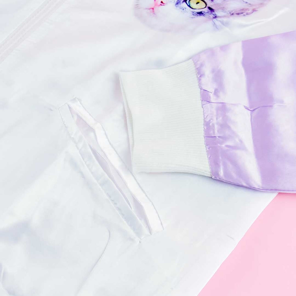 A super kawaii Harajuku-style pastel bomber jacket featuring prints of cats