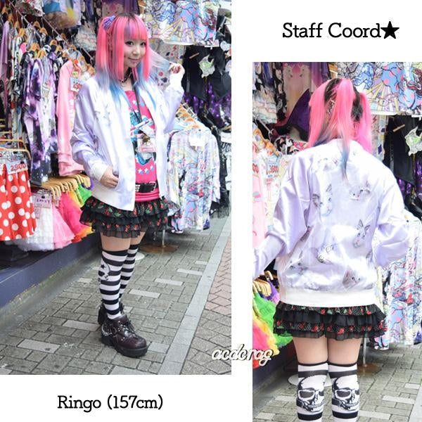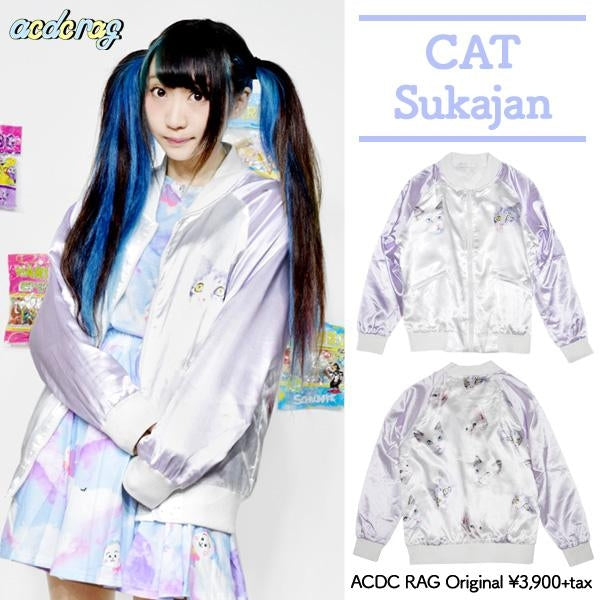 Dress up in Harajuku fashion by putting on this super cute bomber jacket! This pastel-colored jacket features prints of two kawaii cats. It comes from a Japanese clothing brand driven by a "No Borders" concept inspired by Takeshita-dori in Harajuku, Japan.
