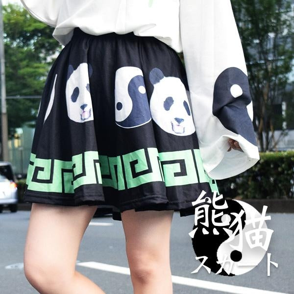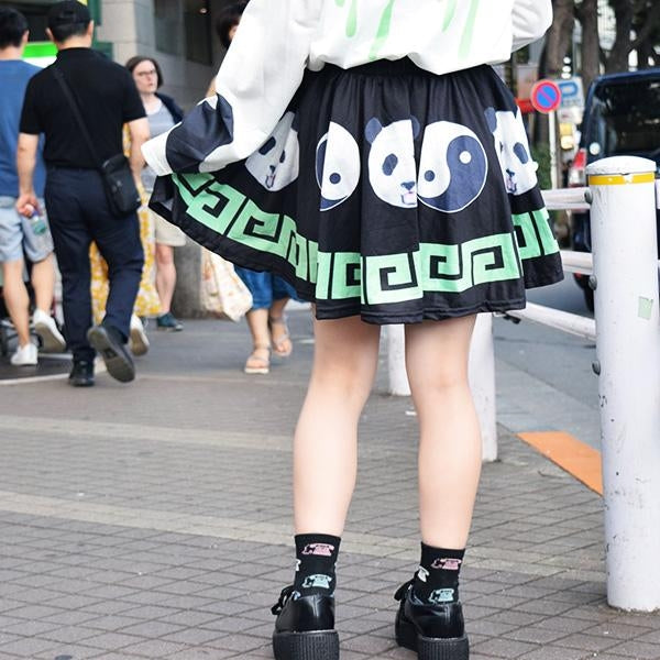 A kawaii swing skirt with illustrations of pandas and yin yang symbols
