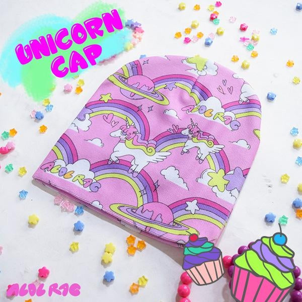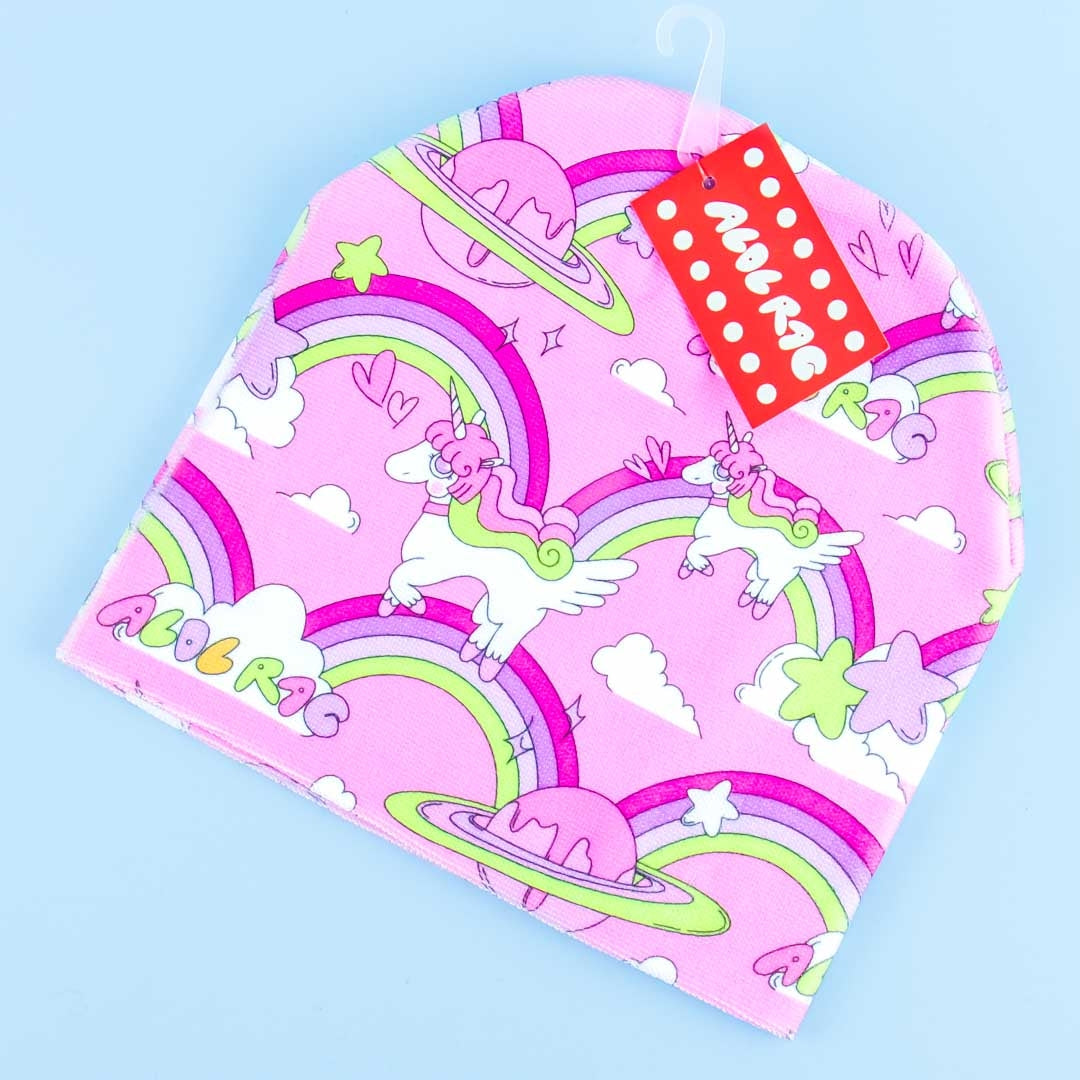A cute pink Harajuku-style beanie hat with prints of pink unicorns floating in the sky with rainbows