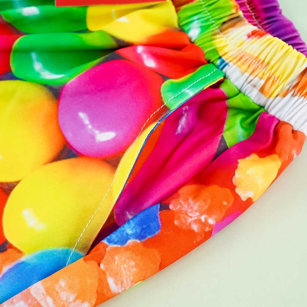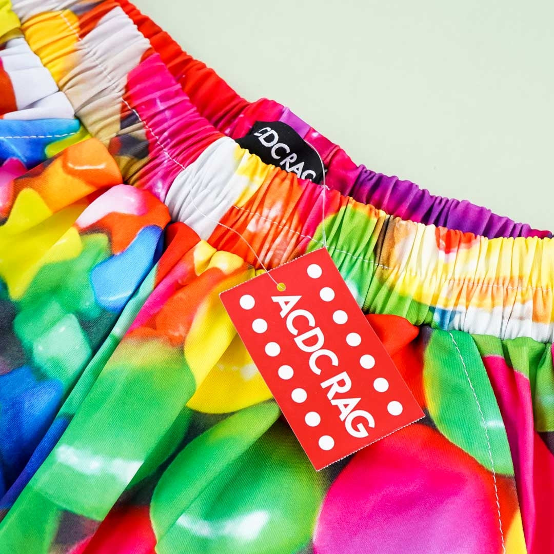 • A pair of Harajuku-style pop art shorts covered in prints of bright candy
