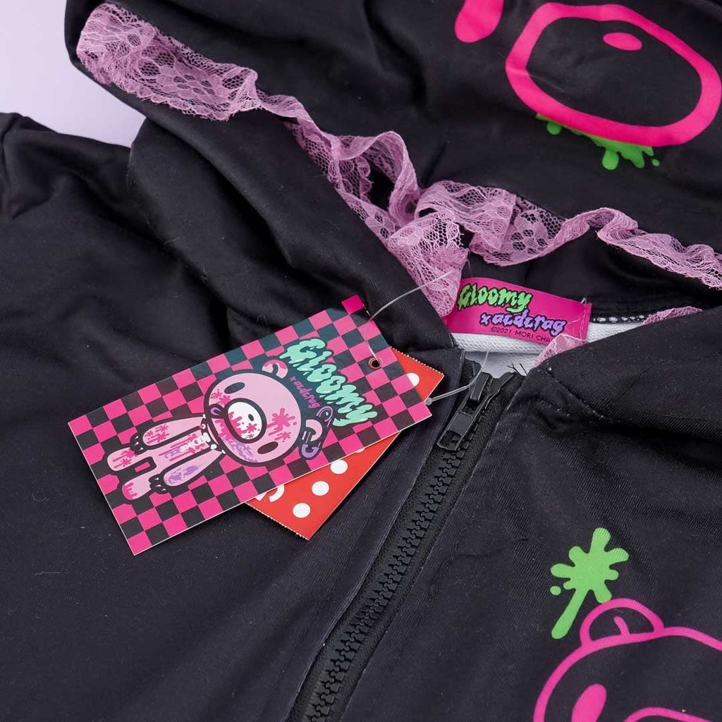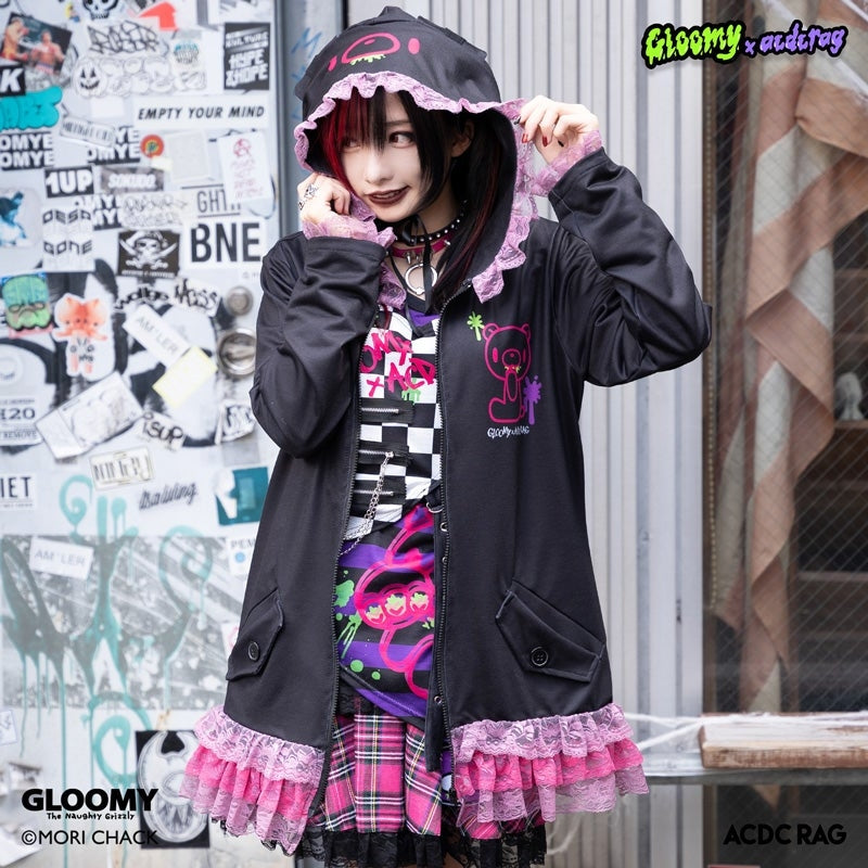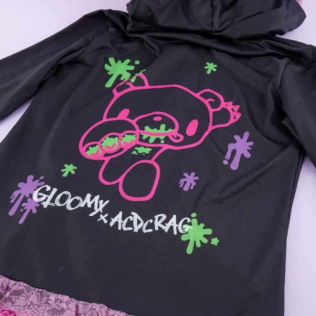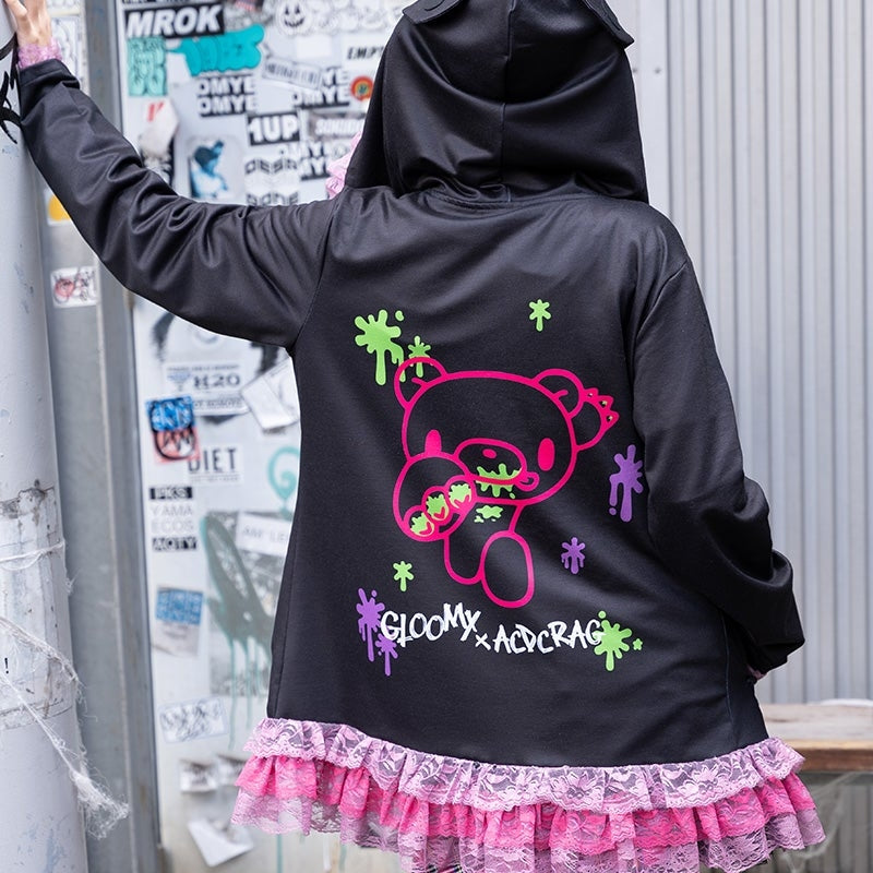 Keep yourself warm during cool, windy days by wearing this super kawaii hoodie featuring vivid prints of Gloomy Bear. It also has a cute Gloomy Bear hood and a fun, frilly design! This jacket comes from ACDC Rag, a popular Harajuku fashion brand inspired by a "No Borders" concept.