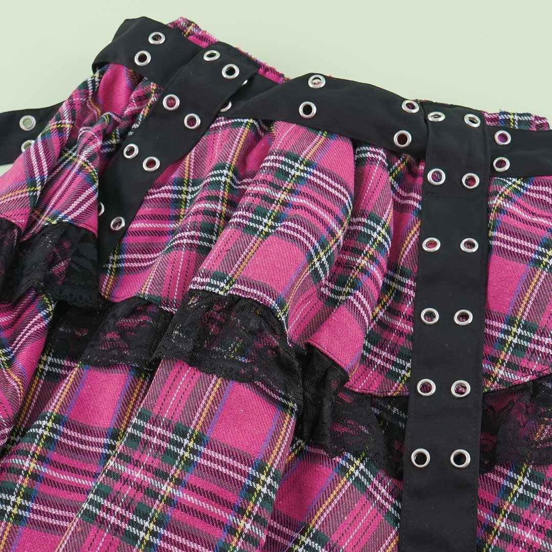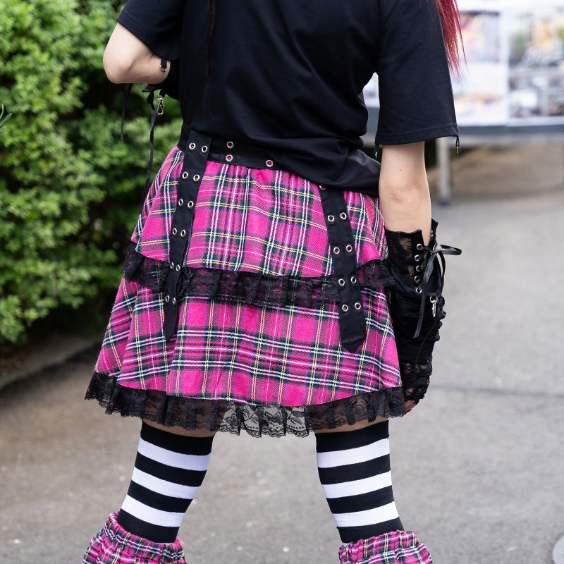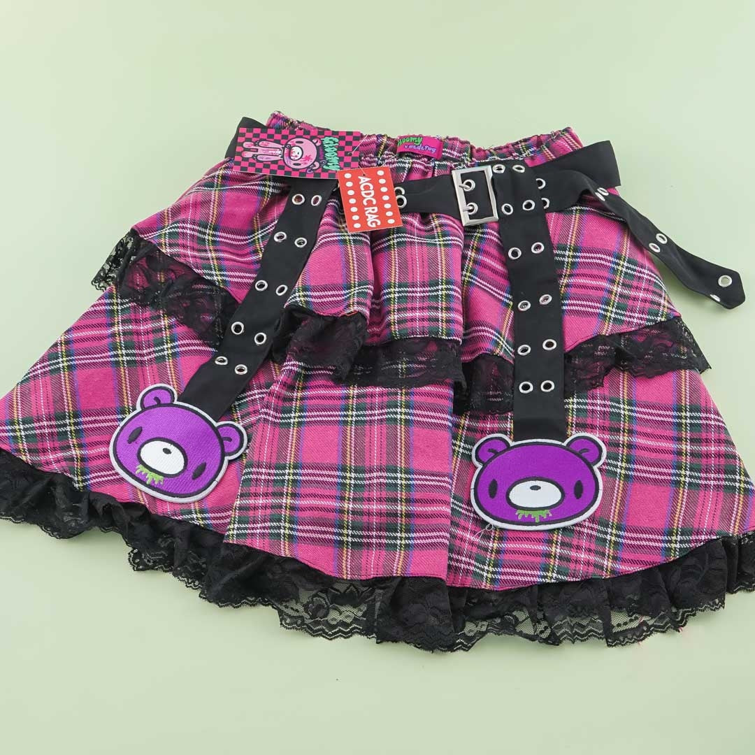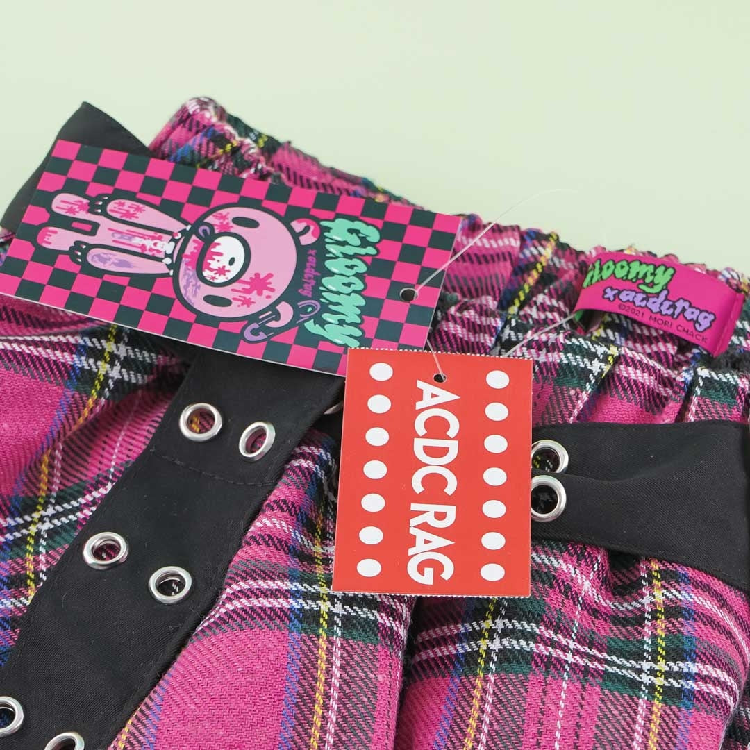 Wear this kawaii checkered skirt illustrated with a vivid pink print of Gloomy Bear. It has a gothic punk belt décor design. This skirt comes from ACDC Rag, a popular Harajuku fashion brand driven by a "No Borders Concept."