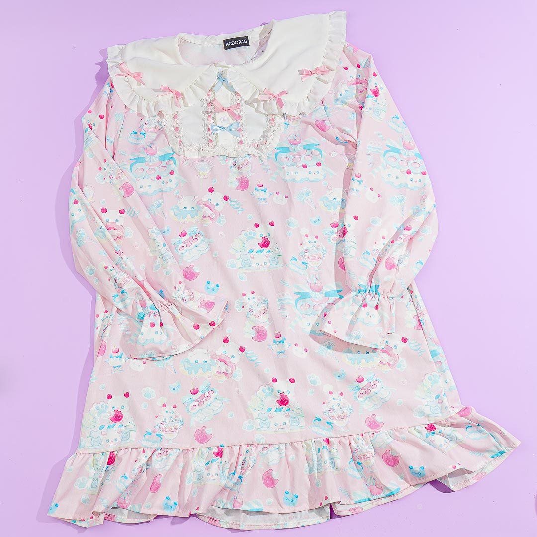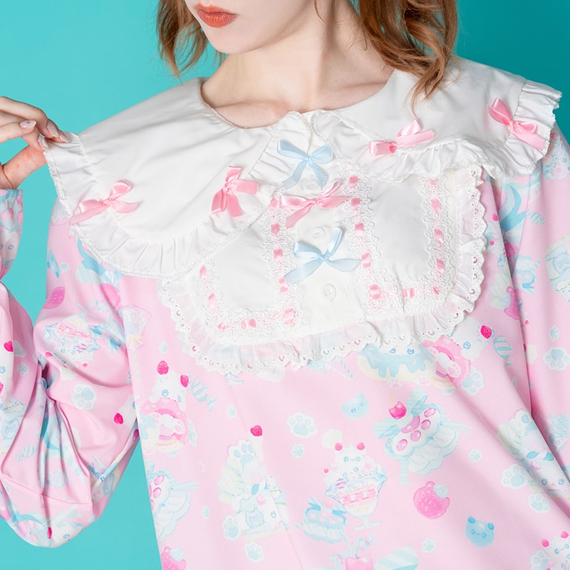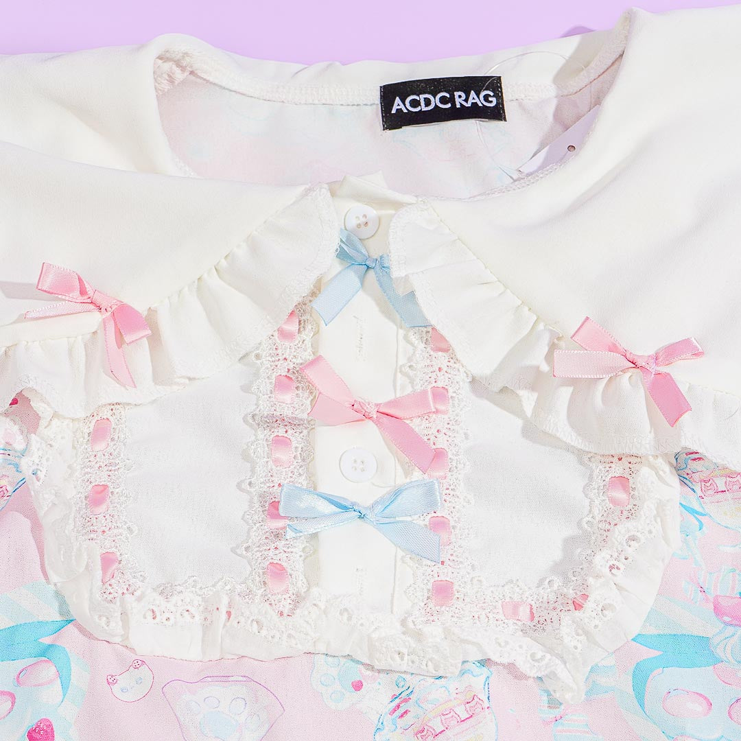 This super cute Harajuku-style pastel dress features prints of kawaii kittens and ribbon decors. It comes from a Japanese clothing brand inspired by a "No Borders" concept from Takeshita-dori in Harajuku, Japan. Add it to your kawaii wardrobe for the season!