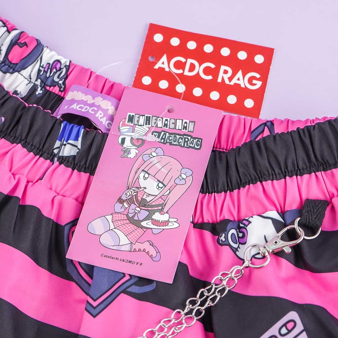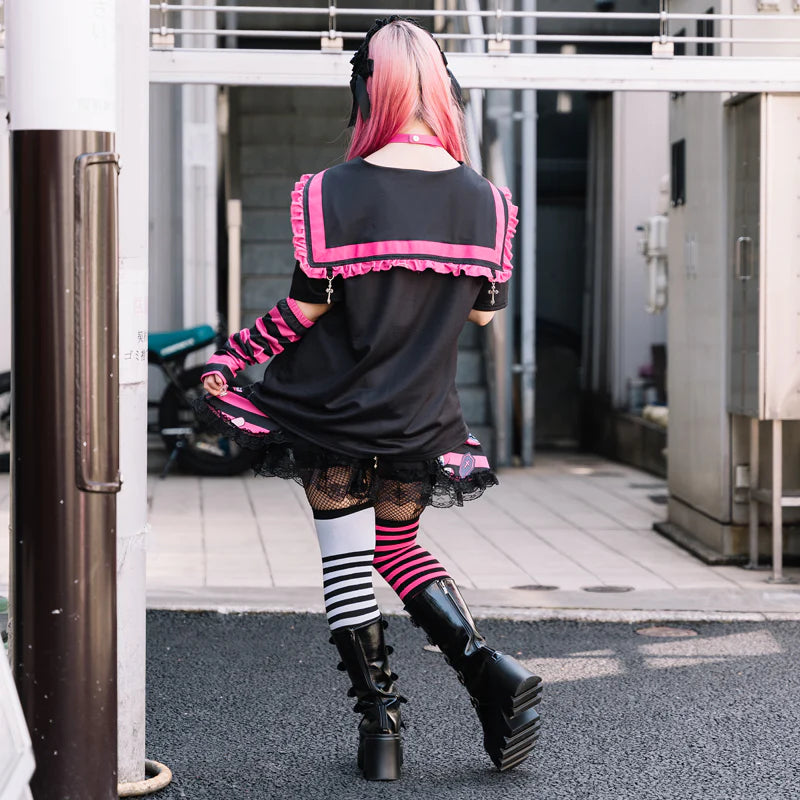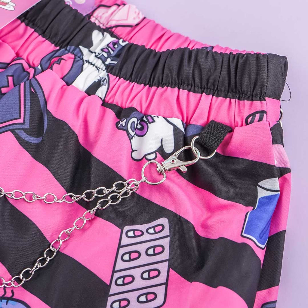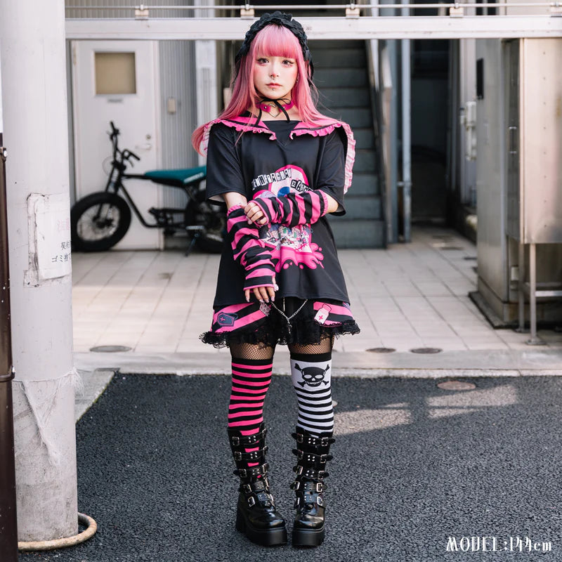 Channel your inner emo-punk style by donning this lace black skirt with chains and crosses!! This Harajuku-inspired brand got its inspiration from the colorful street of Takeshita. The frilly mini skirt is made of super-soft polyester with vibrant pink and black stripes — as well as Yami Kawaii or “sick cute” themed prints from the popular character, Menhera-chan created by Bisuko Ezaki!