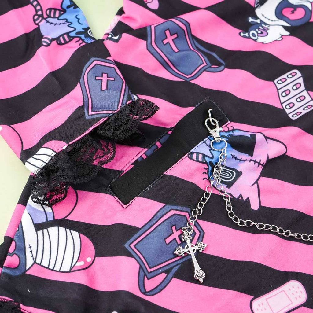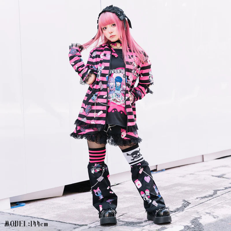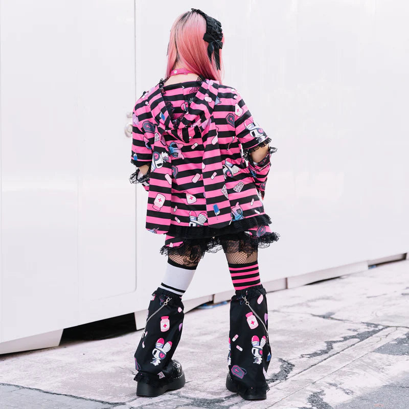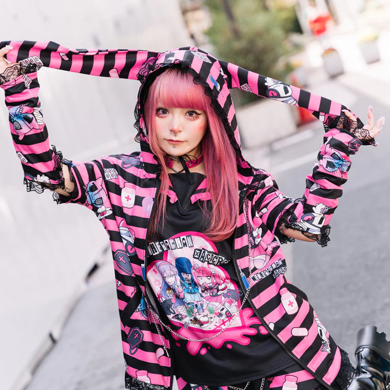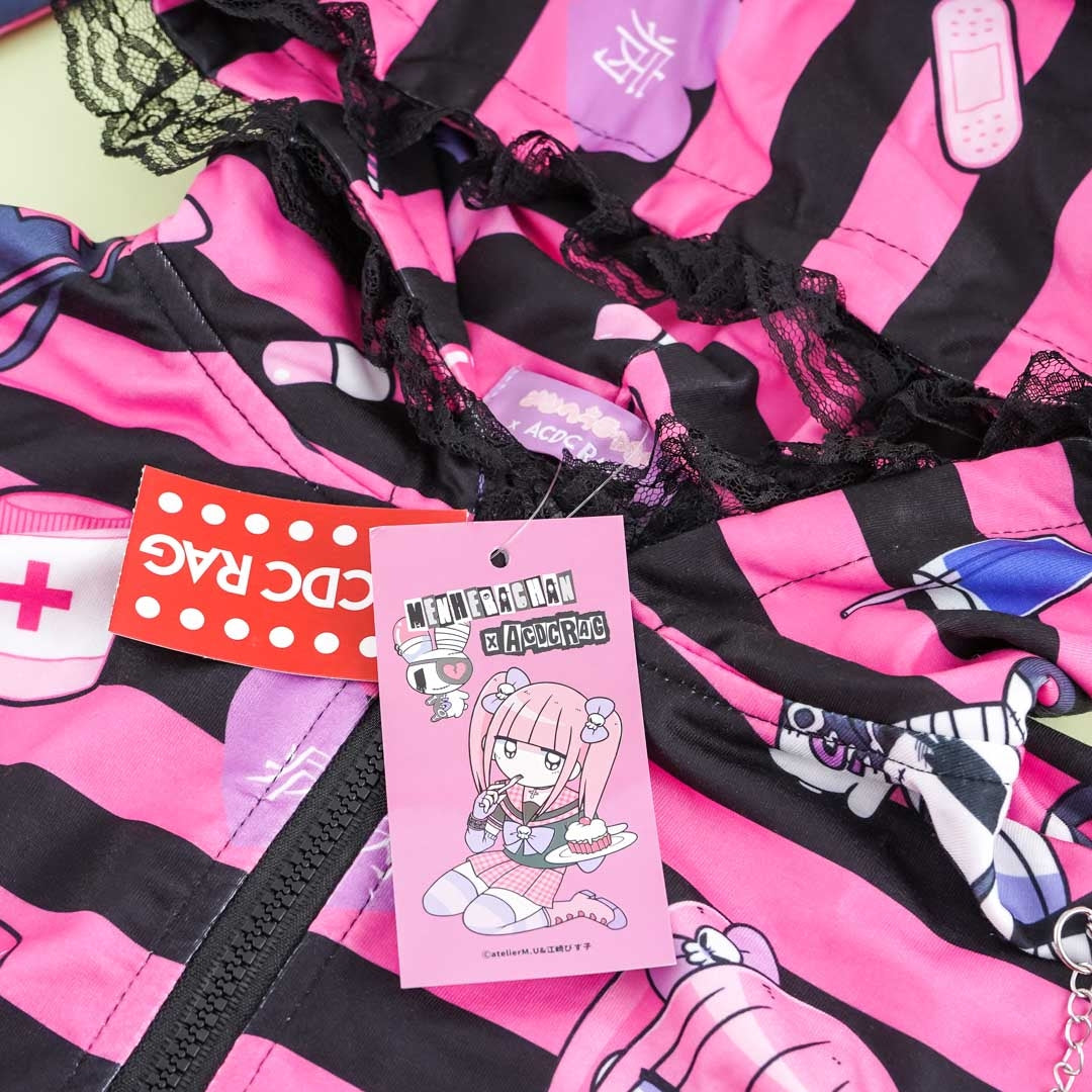 Make a statement with this unique black and pink-striped parka from the ACDC RAG and Menhera-chan collab that screams Harajuku emo-punk style all over! This original brand based in Takeshita Dori is known for its unique kawaii designs. The zippered hoodie has cute bunny ears, black lace trimmings, metal crosses that have chains, and character illustrations from the Yami Kawaii or “sick cute” series created by the Japanese illustrator Bisuko Ezaki.