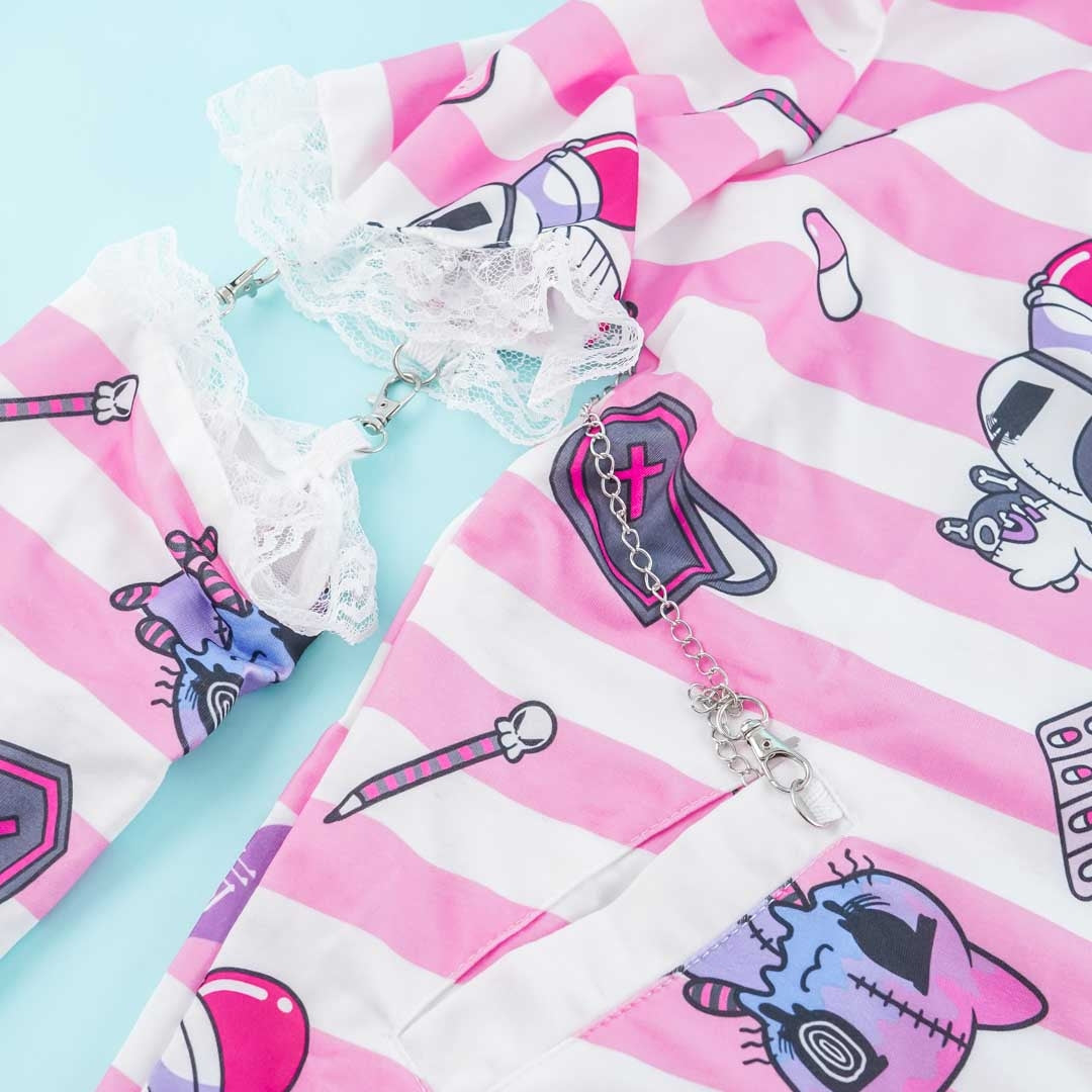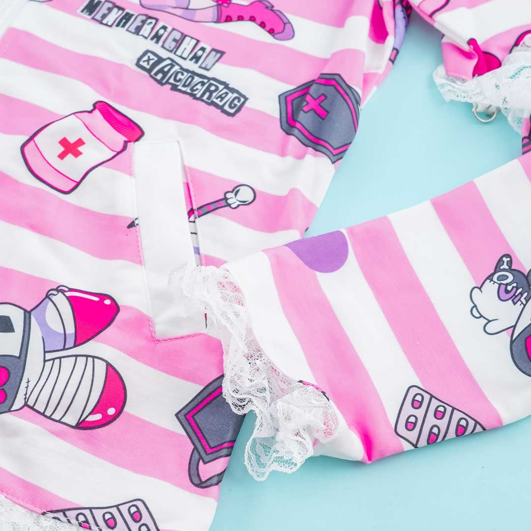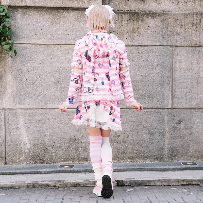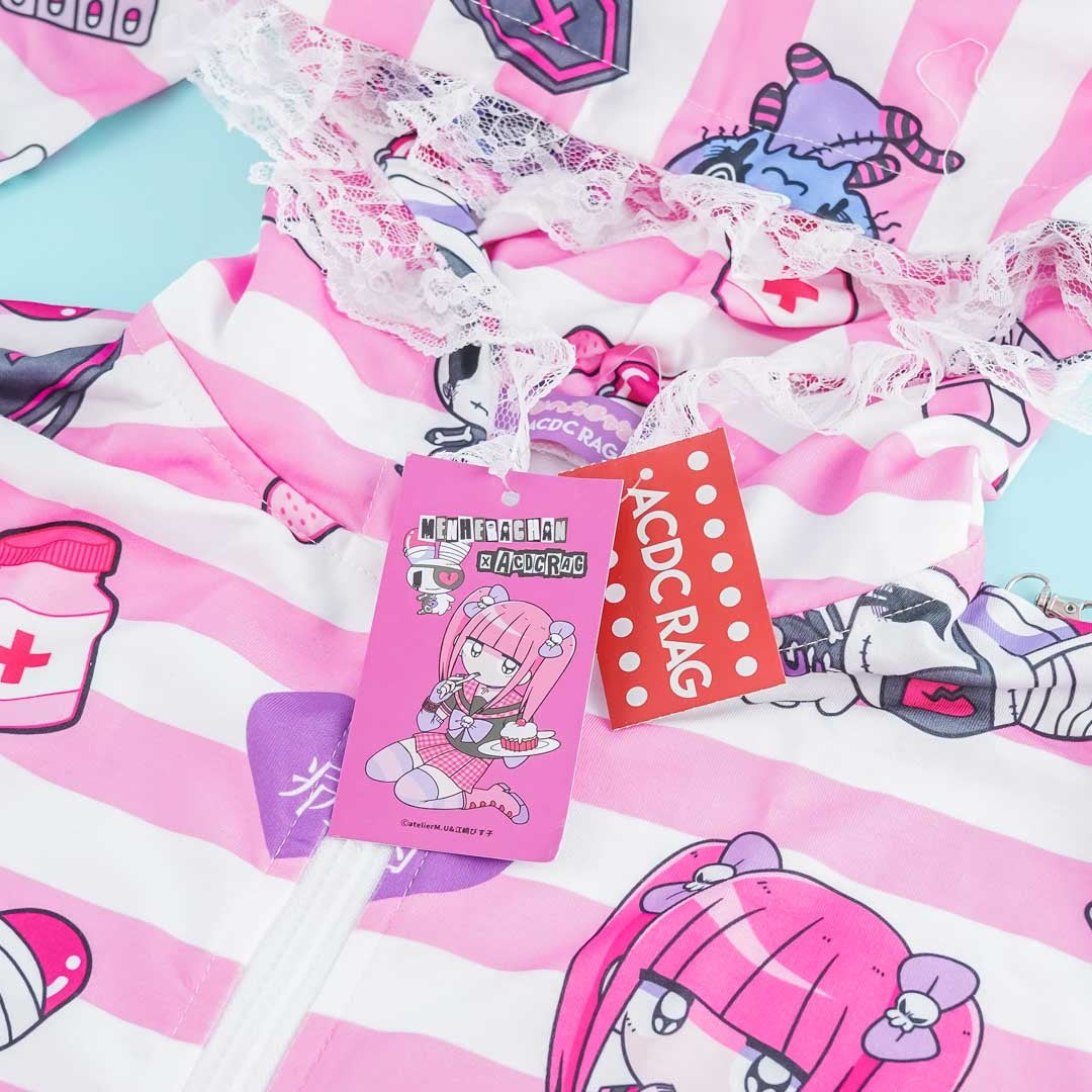 Keep yourself warm and cozy by wearing this pink and white striped hoodie from the collaboration of ACDC RAG and Menhera-chan! This famous Harajuku-based clothing brand is known for its eccentric designs inspired by the streets of Takeshita! The emo-punk zippered parka has unique rabbit ears, white lace trimmings, and metal crosses that have chains. It also has character prints from the Yami Kawaii or ‘“sick cute” series created by Japanese illustrator Bisuko Ezaki.
