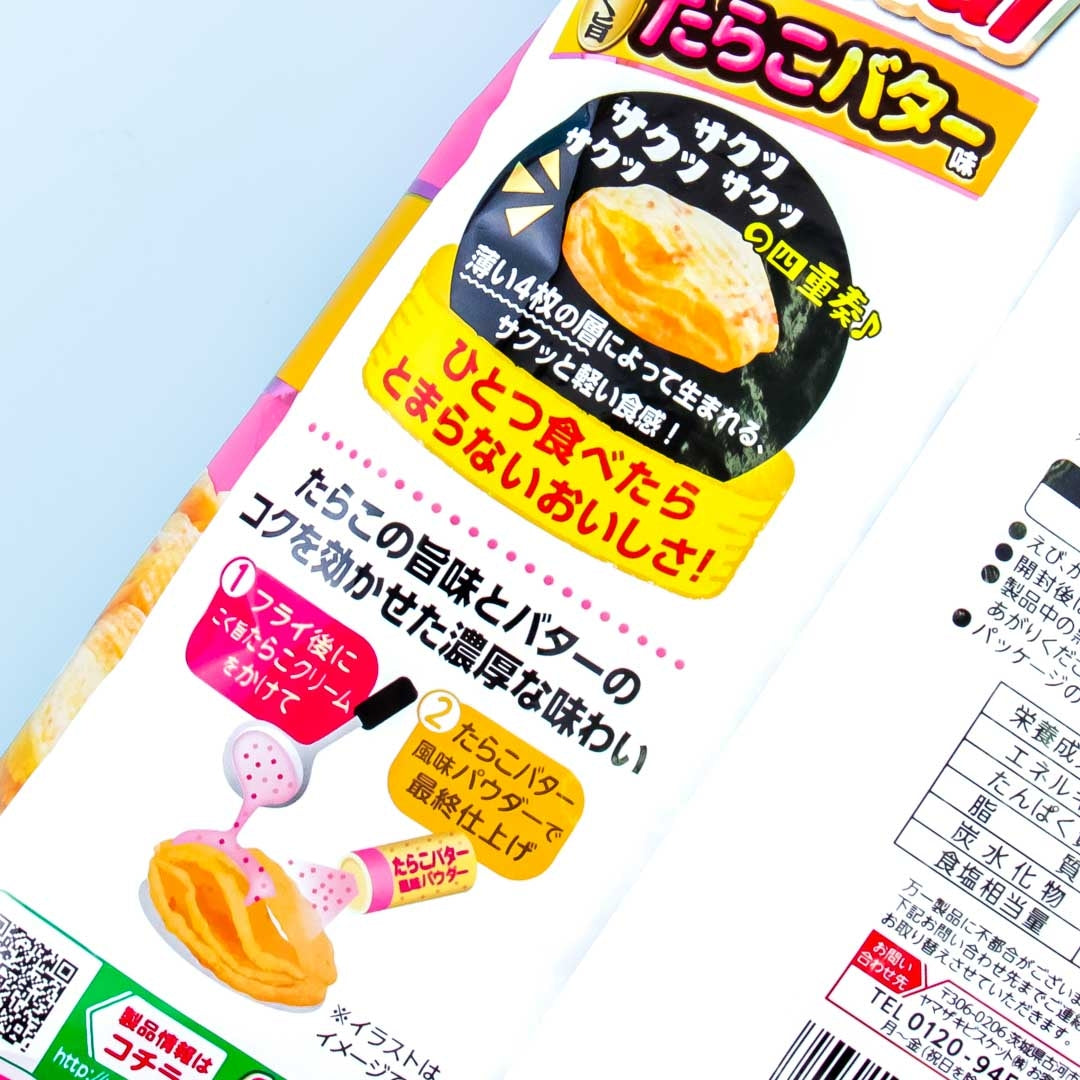 A bag of buttery pollock roe-flavored corn snacks with four crunchy layers