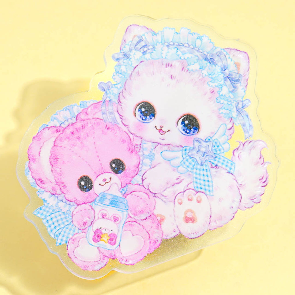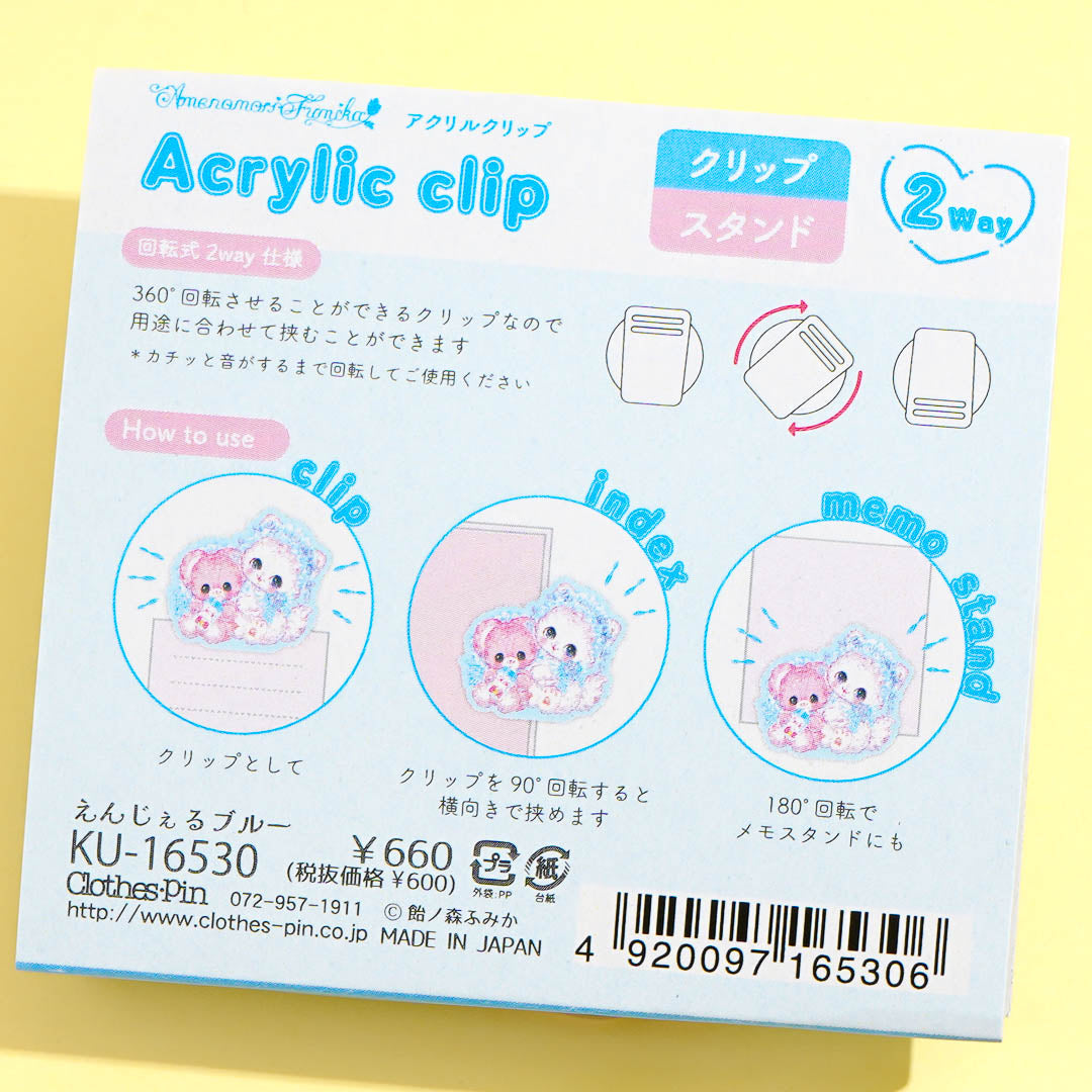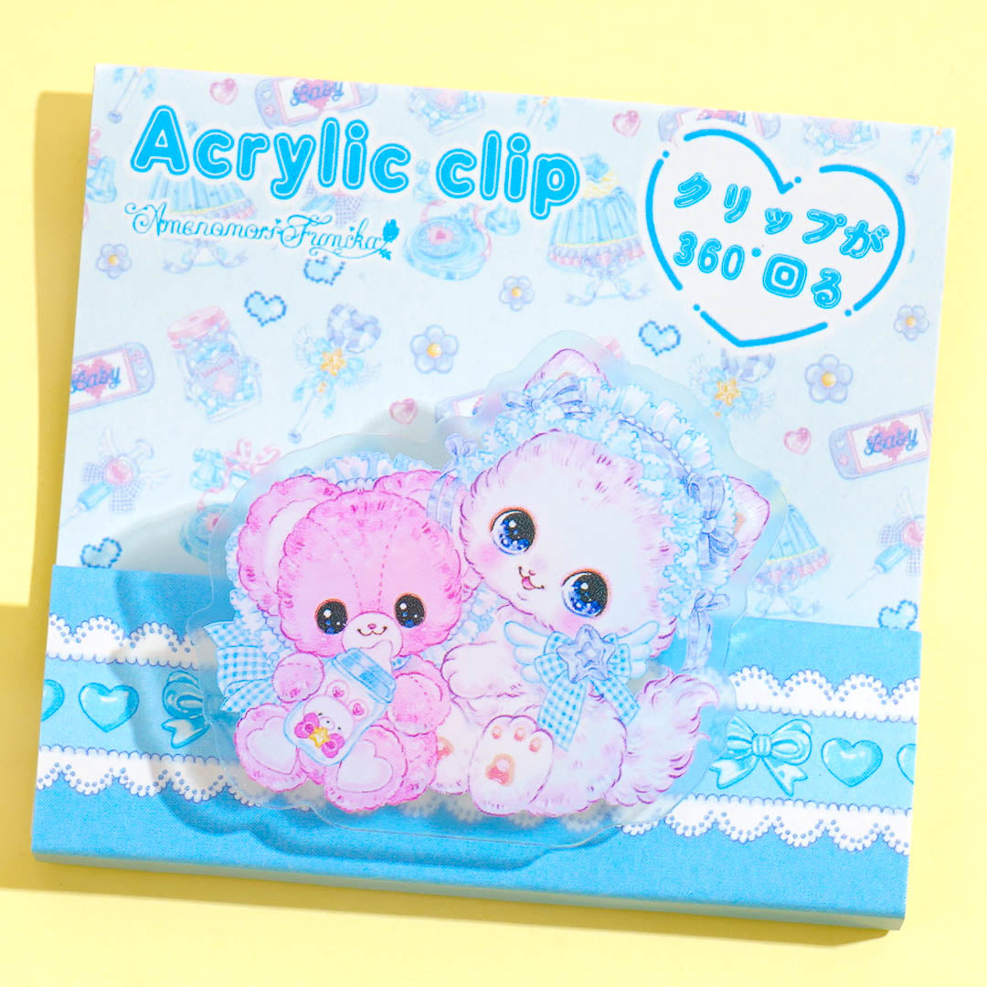 Add a kawaii touch to your files with this acrylic clip featuring cute pastel art by Amenomori Fumika. The Angel Blue design showcases a fluffy kitten and bear duo dressed in blue ribbons. It's perfect for holding papers, decorating bags, or cute desk decor!