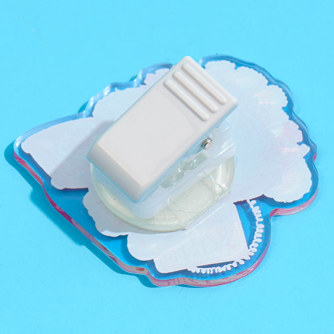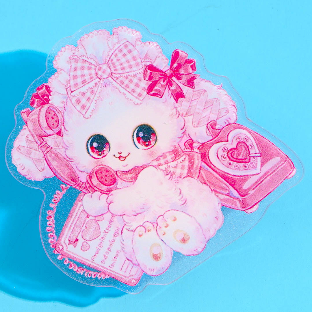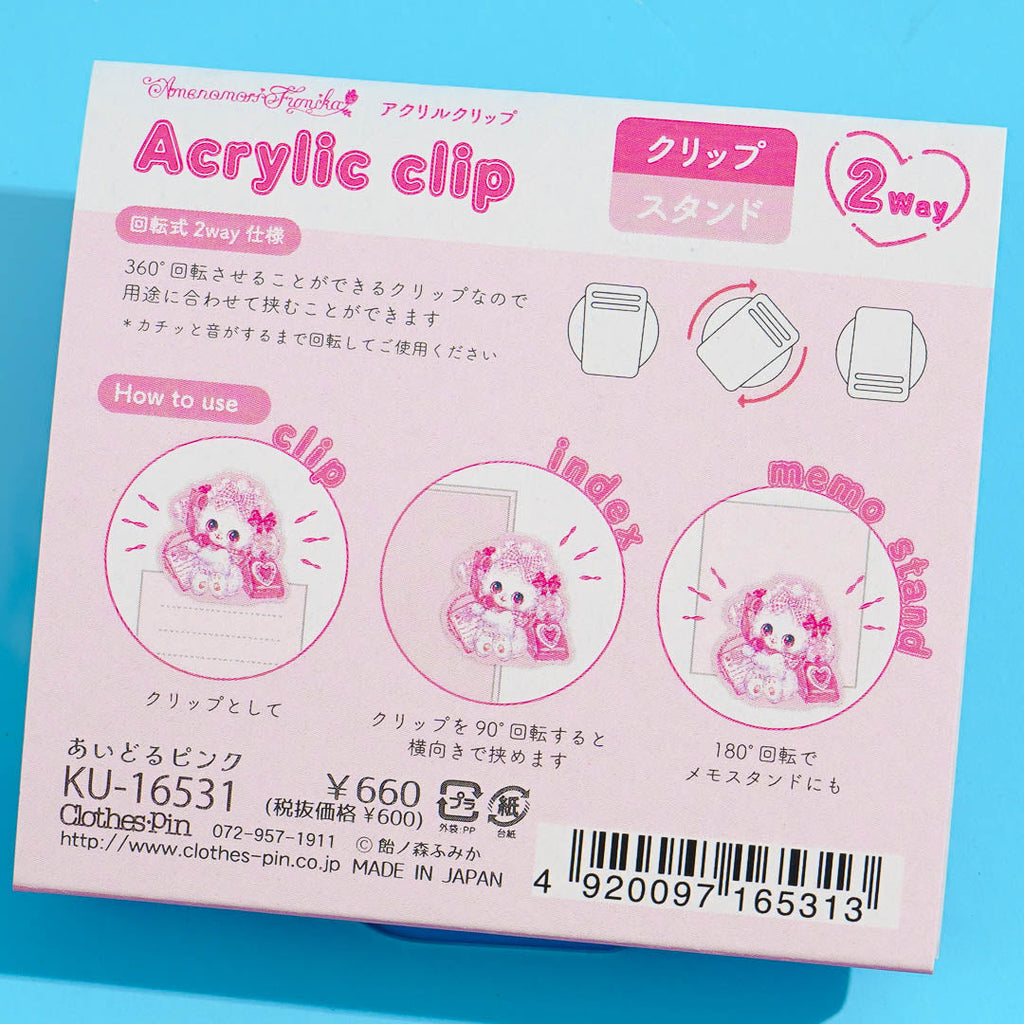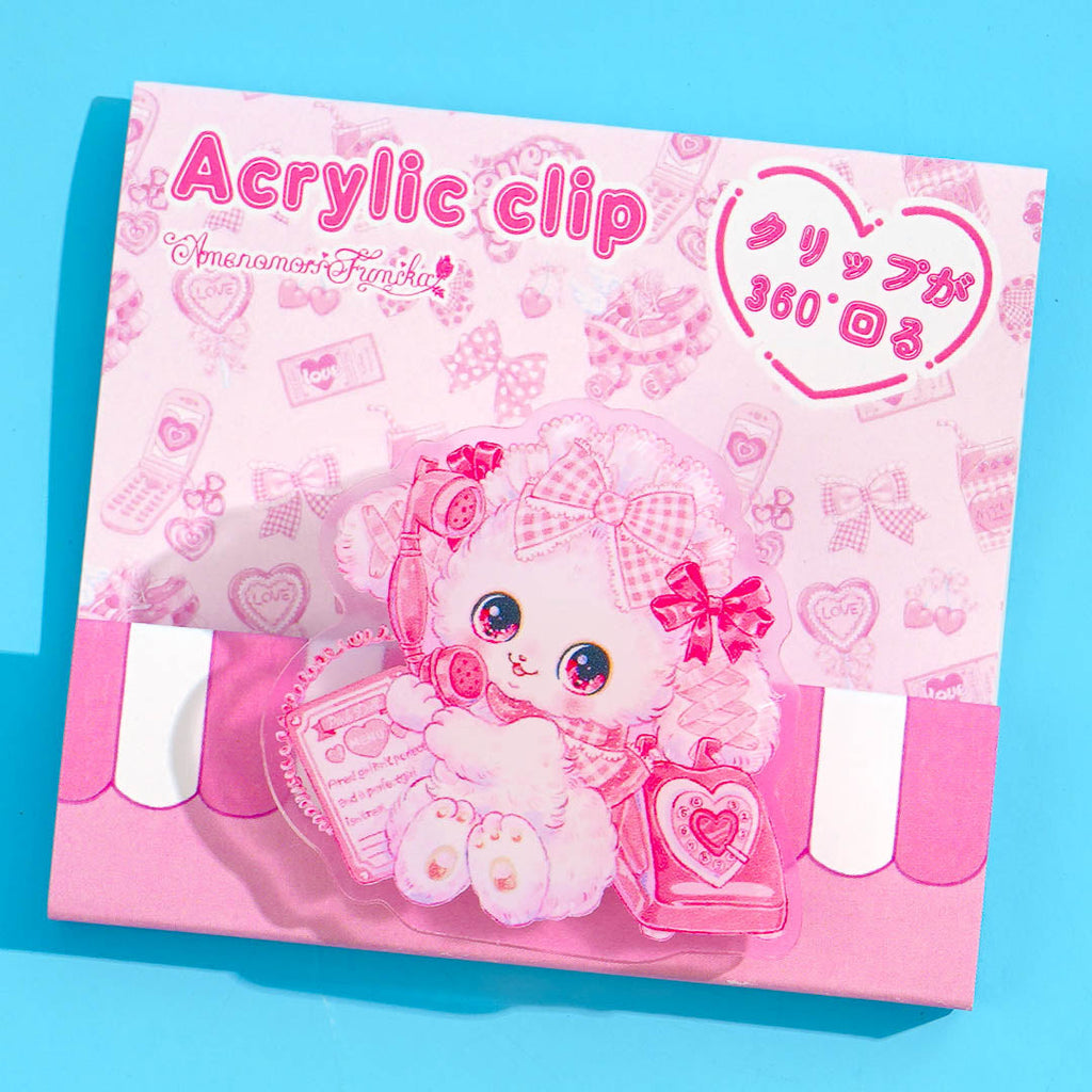 This super cute acrylic clip showcases a die-cut illustration of a fluffy bunny from Amenomori Fumika's "Idol Pink" design. Use it to clip your memos or save a page when reading a book! The clip can even be rotated 360 degrees.