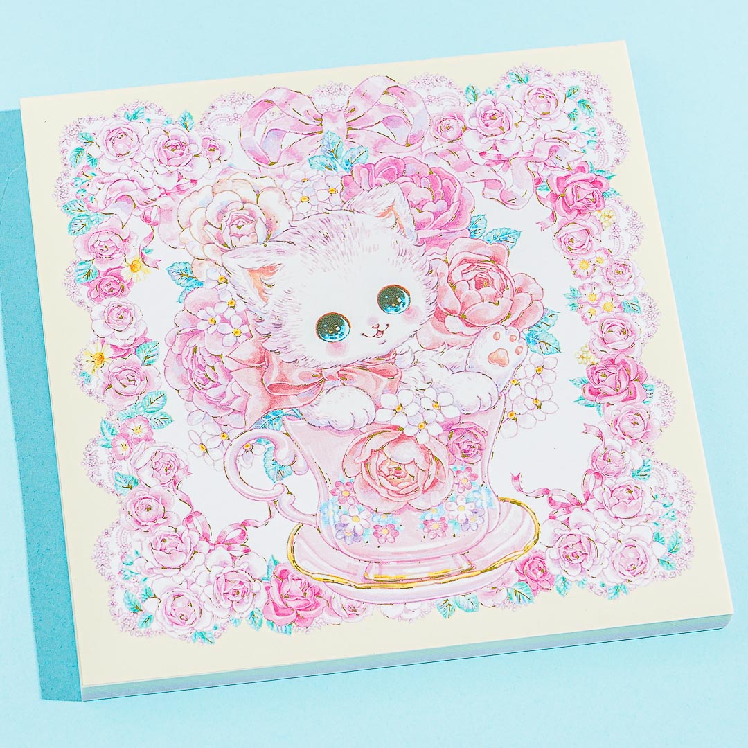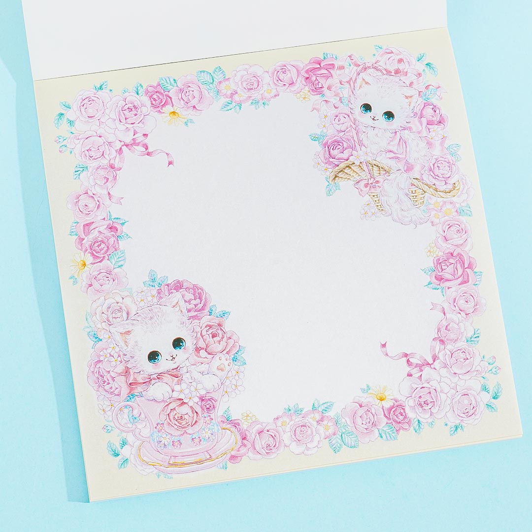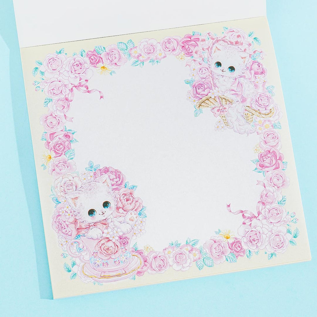 This cute memo pad is decorated with Amenomori Fumika white cat characters surrounded by lots of blooming roses! Write important reminders or sweet notes using the square-shaped sheets.