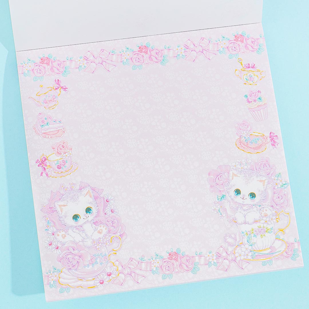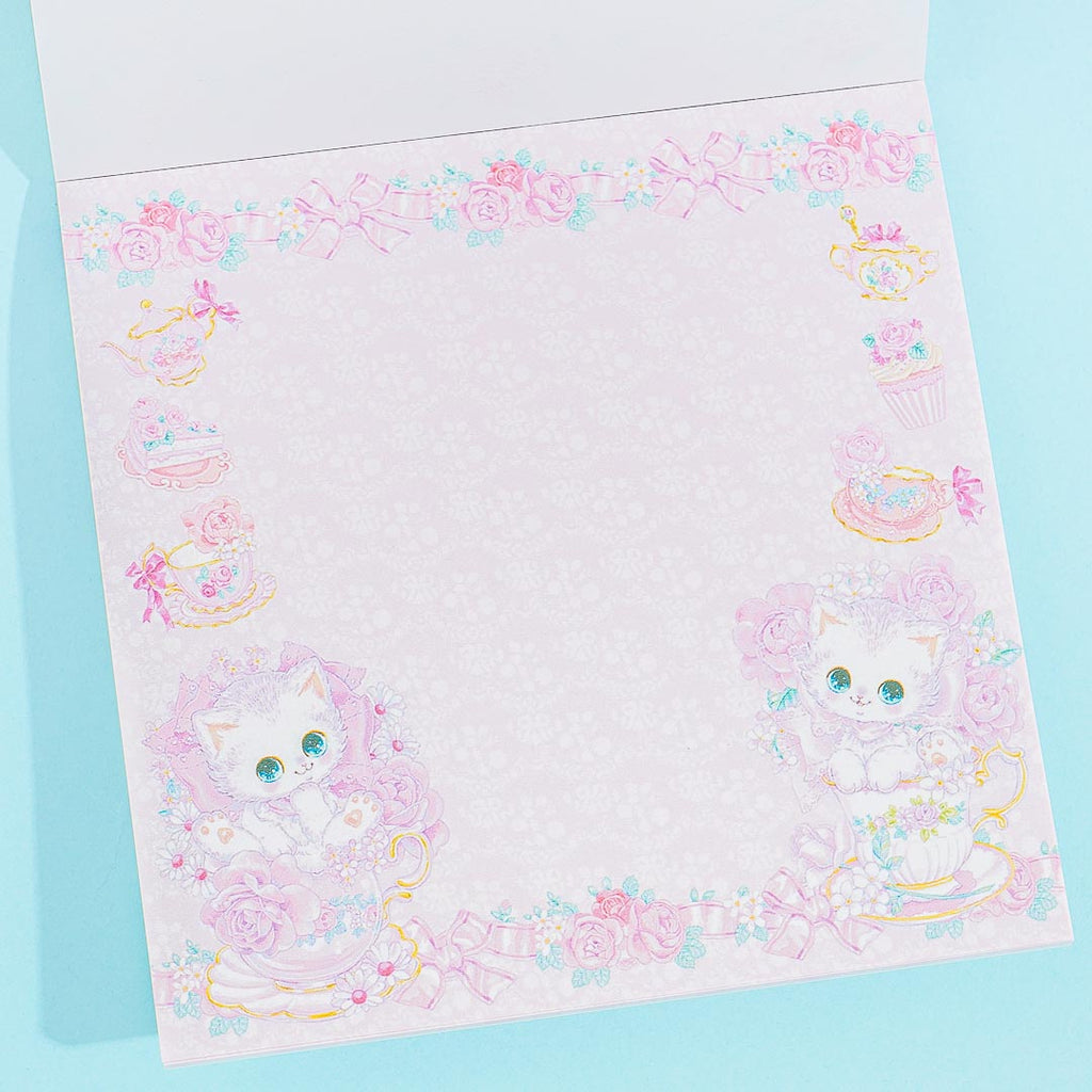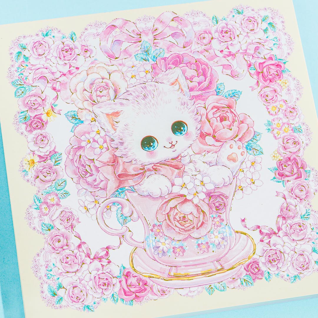 This cute memo pad is decorated with Amenomori Fumika white cat characters surrounded by lots of blooming roses! Write important reminders or sweet notes using the square-shaped sheets.