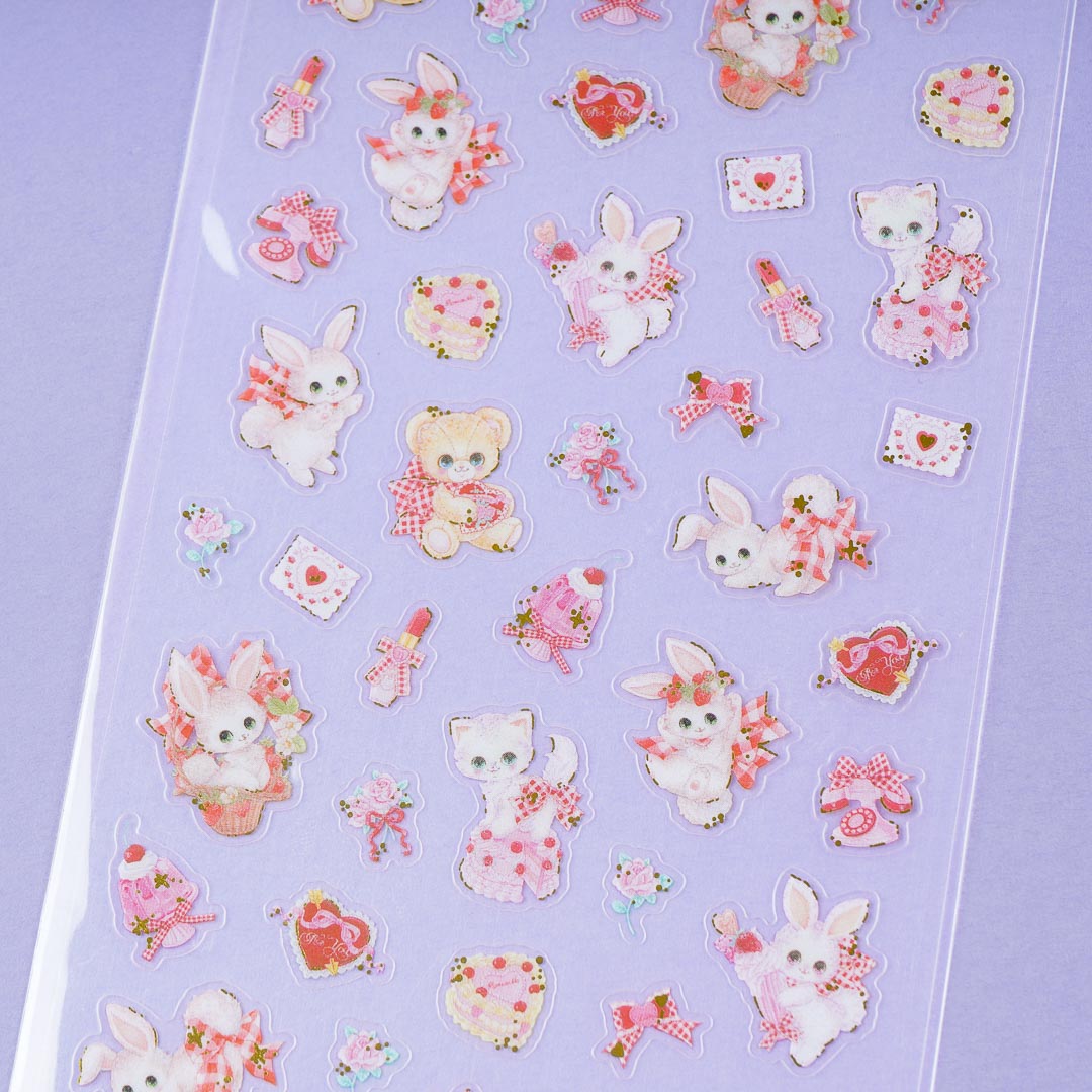 Kawaii-fy your letters with these die-cut stickers! This sheet of small stickers features illustrations of cute Amenomori Fumika cats and bunnies with Valentine's Day-themed items. They're perfect for love letters!
