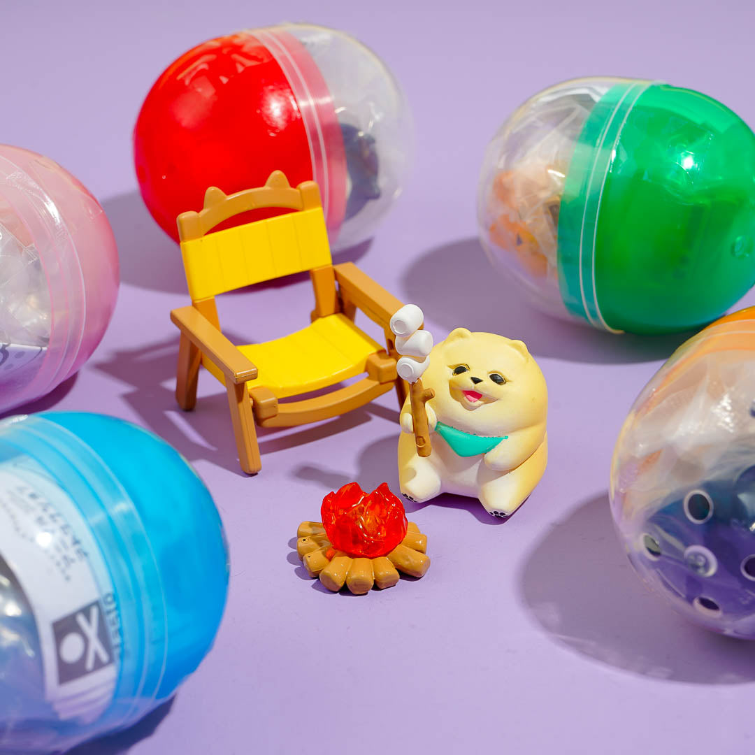 This kawaii figure features cute and fluffy dogs having fun on a campsite. It's enclosed inside a gachapon capsule so you'll get a surprise design. Place this super cute figure on your desk for a touch of kawaii!