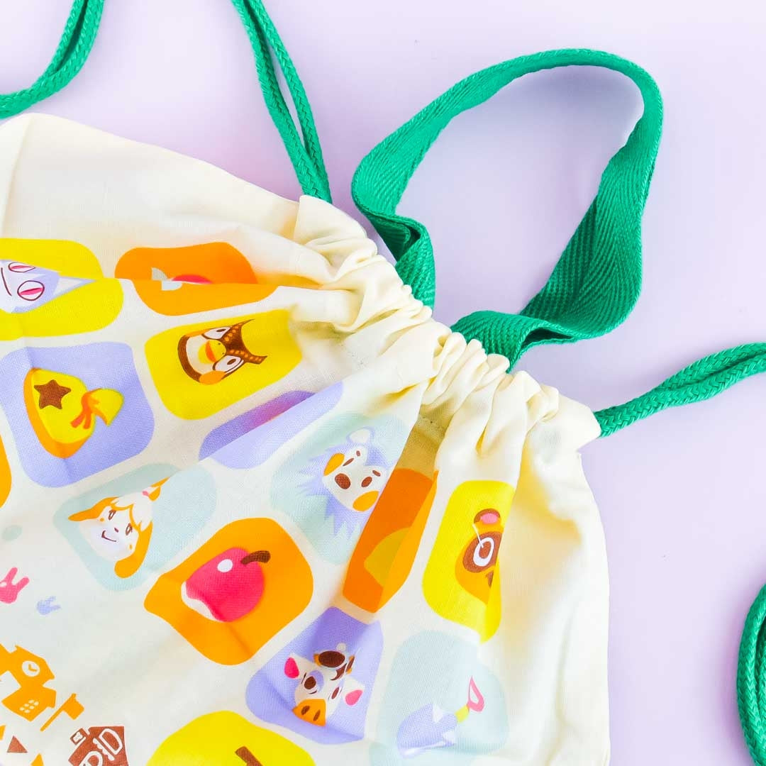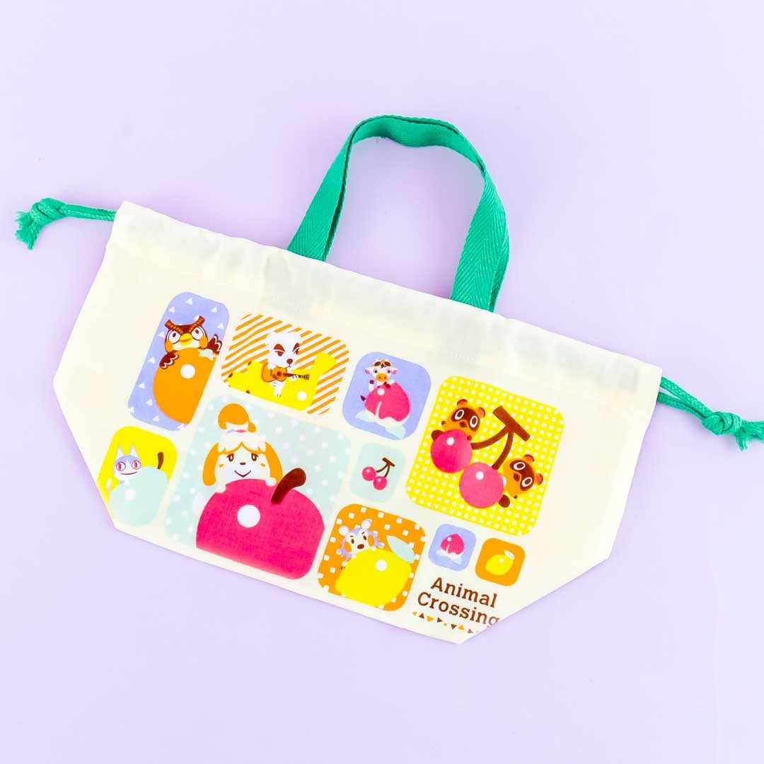 A super kawaii drawstring lunch bag illustrated with Animal Crossing characters and fruits