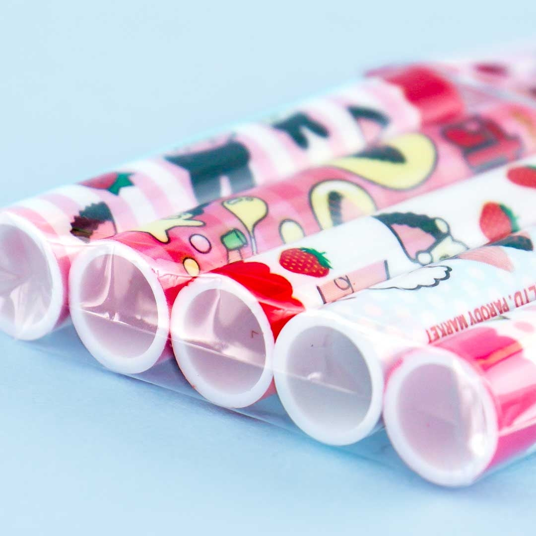 Prevent your pencils from making unnecessary lead marks by using these colorful pen caps! This set features illustrations of strawberries, Meiji Apollo Strawberry Chocolate candies, and its kawaii mascot named Apollo.