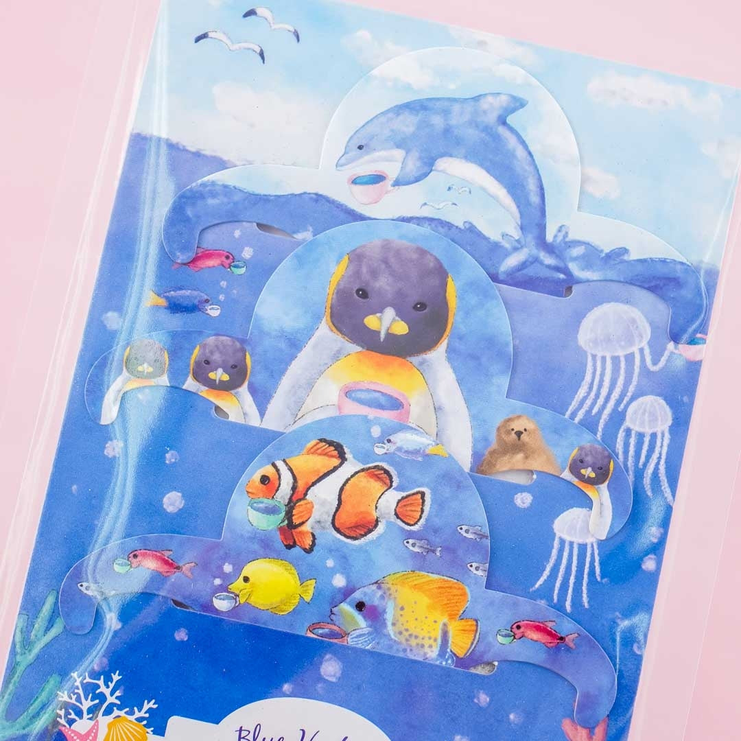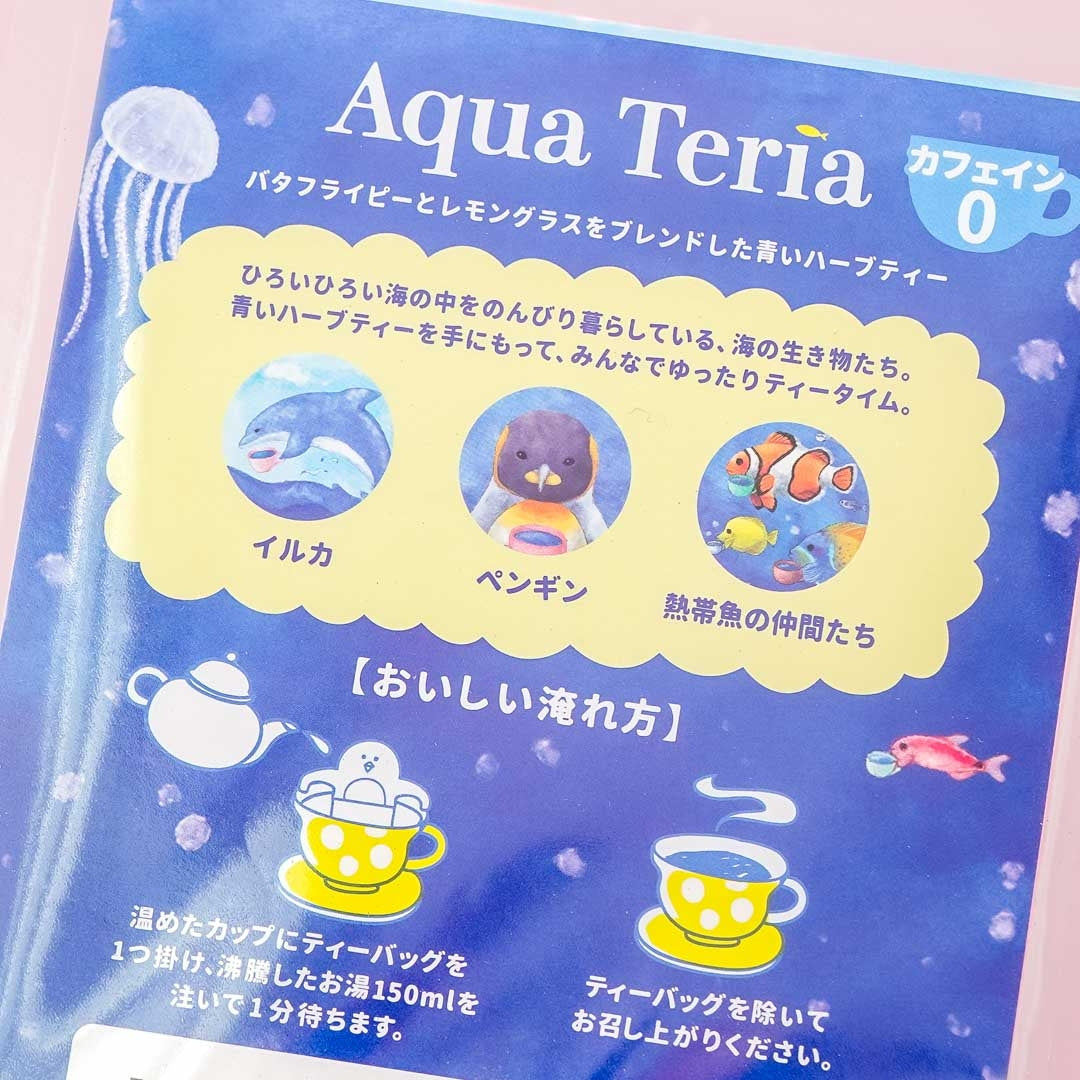 • A pack of blue herbal tea bags with hooks showcasing sea creatures
