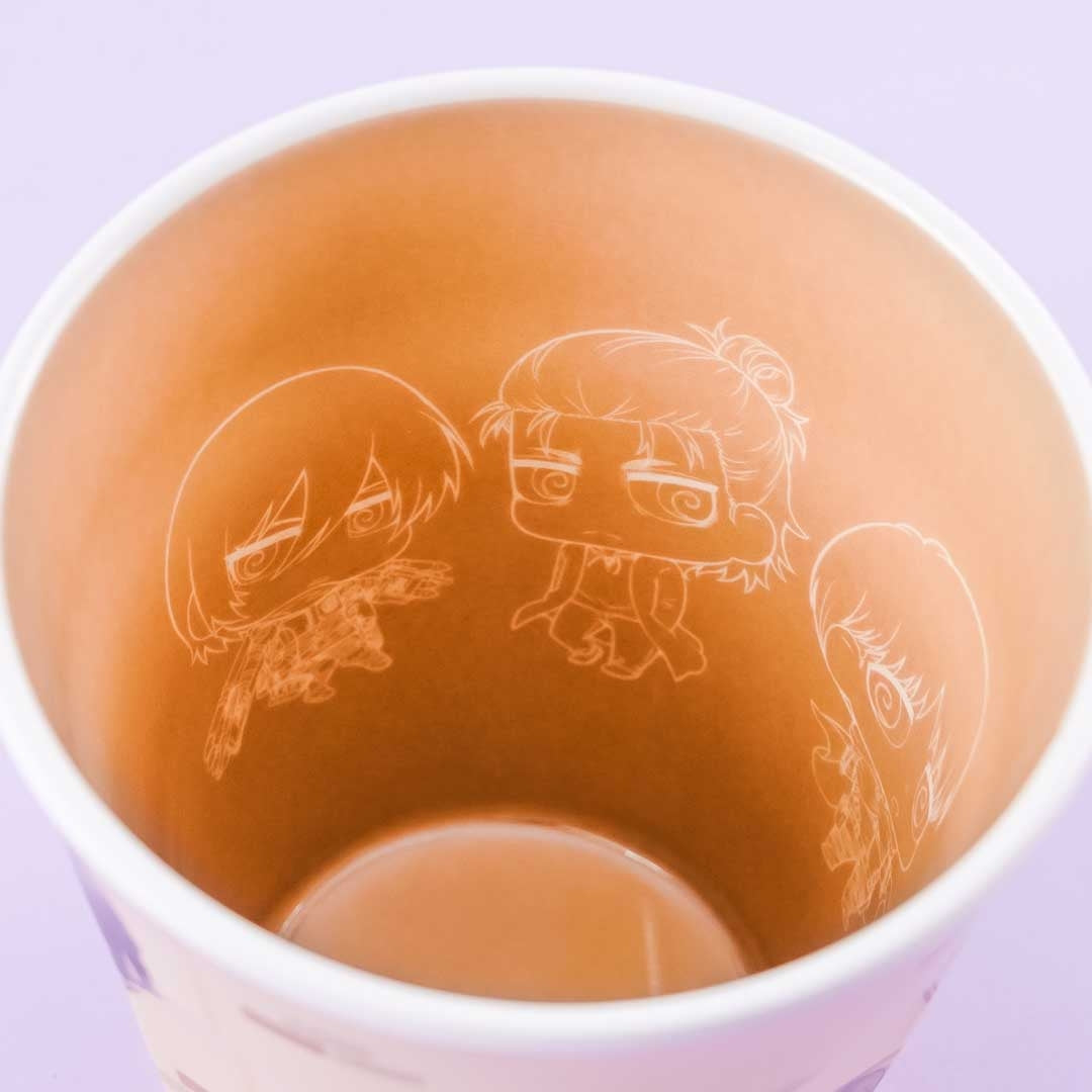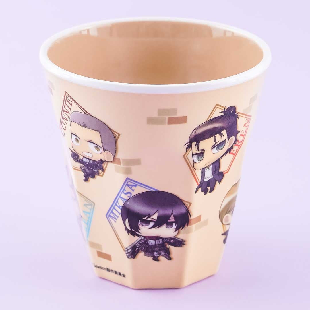 A kawaii drinking cup with chibi-style illustrations of Attack On Titan characters