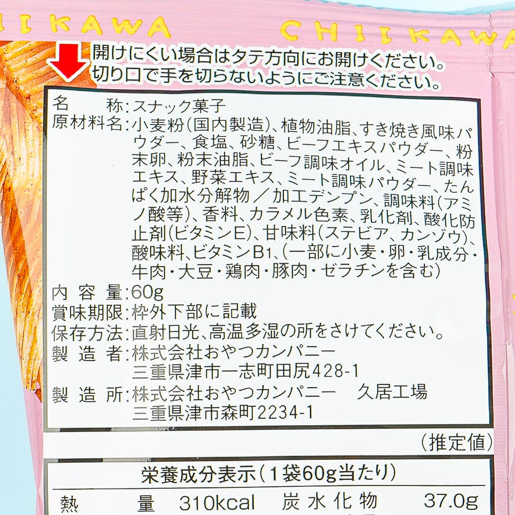 Enjoy this savory snack that looks like dried wide noodles! It comes in a delicious sukiyaki or hotpot meat flavor and features the cute Chiikawa characters.