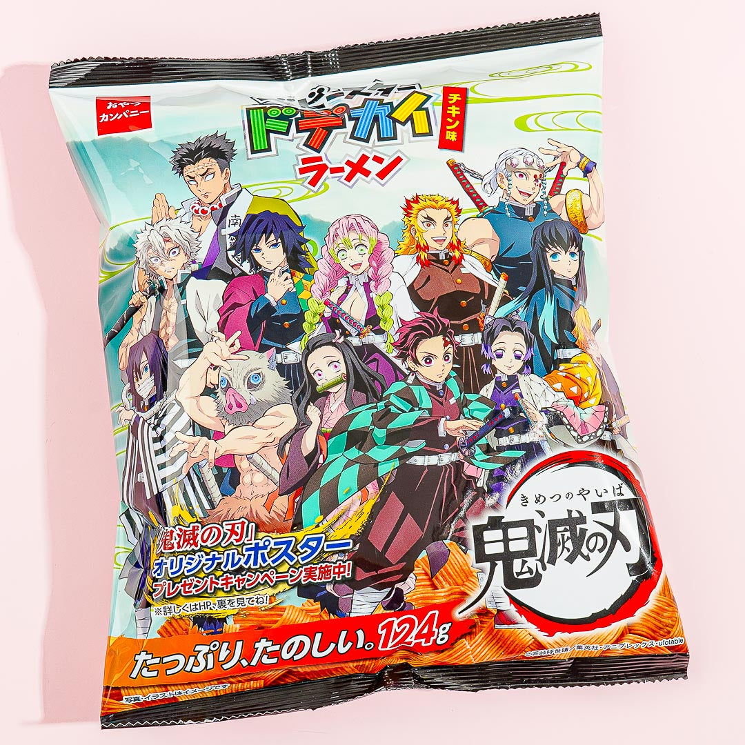 This dodekai ramen or wide noodle snack comes from a collaboration between Baby Star and Demon Slayer! It's a large size pack of dried, ready-to-eat noodles with a savory chicken flavor. Munch on this snack while watching your favorite anime show!