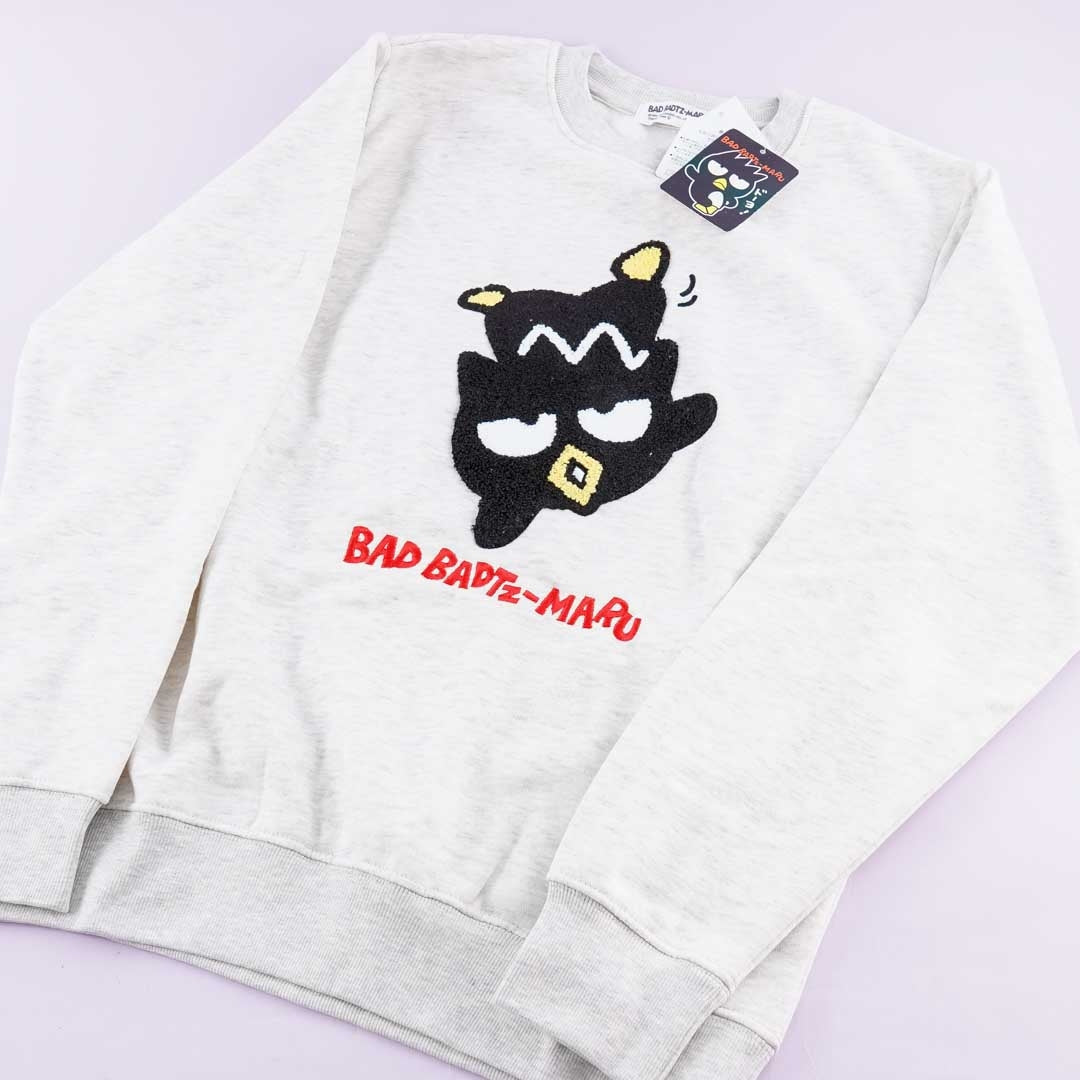 Workout in style by wearing this super cute gray sweatshirt! It features a chenille fabric detail of Bad Badtz-Maru doing a handstand with only one hand!