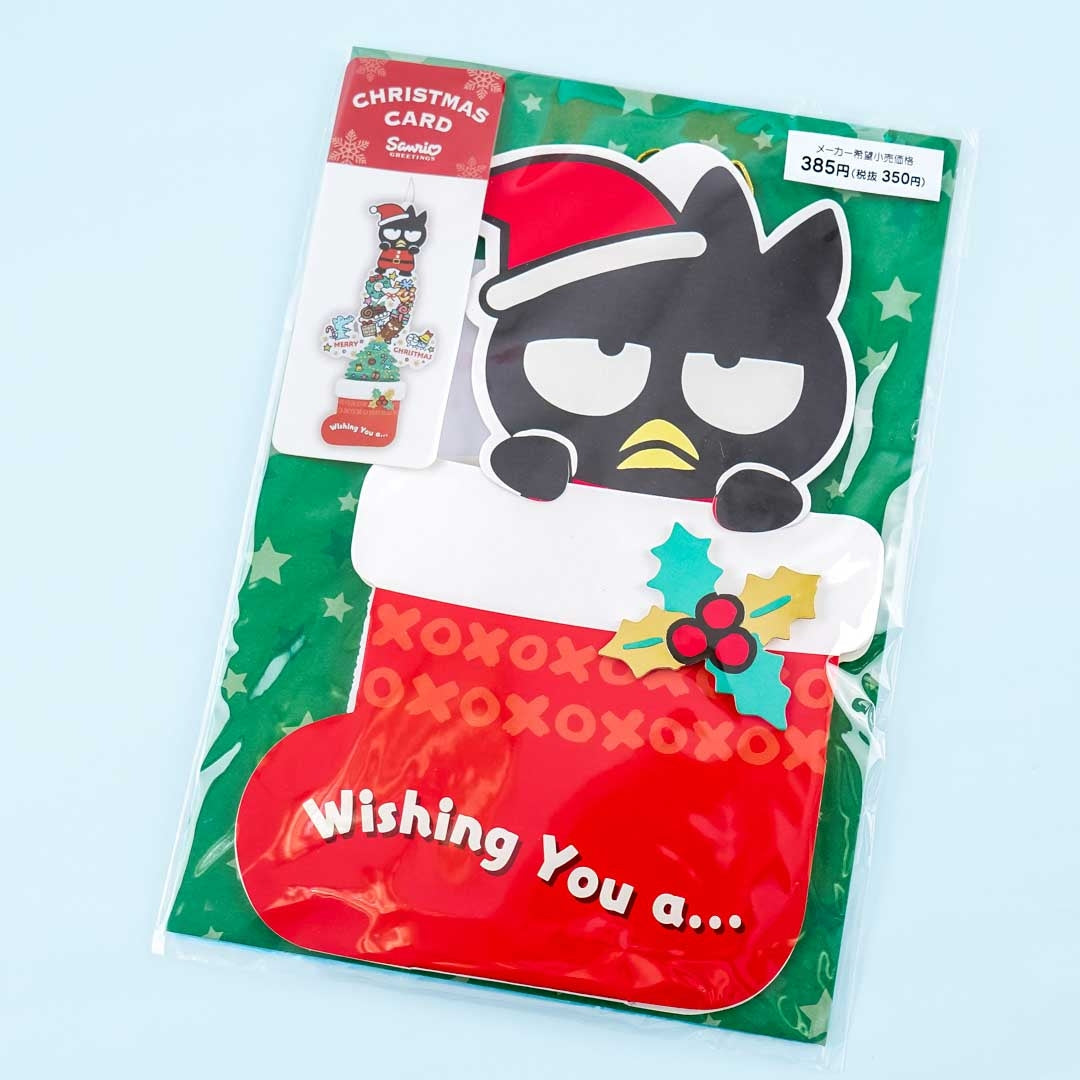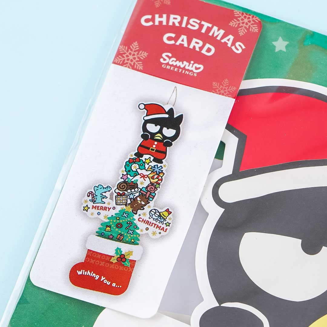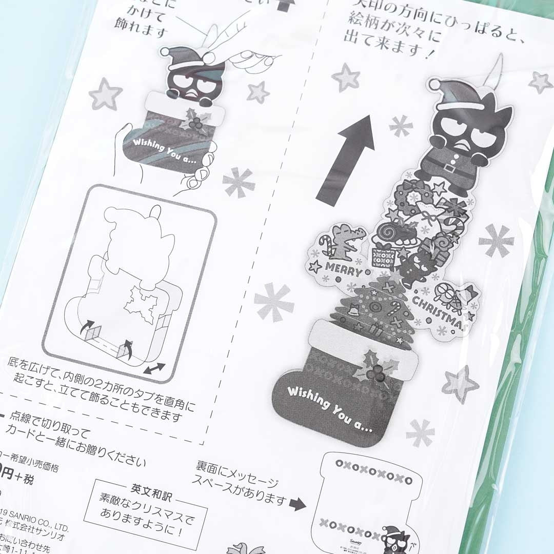 Spread the holiday cheer to your loved ones by sending a kawaii die-cut greeting card! It has a die-cut design of Bad Badtz-Maru wearing a Santa hat and is riding a huge Christmas stocking. Pull the string to reveal a surprise expandable Christmas tree illustration filled with presents and sweets! This super cute card comes with its own envelope.