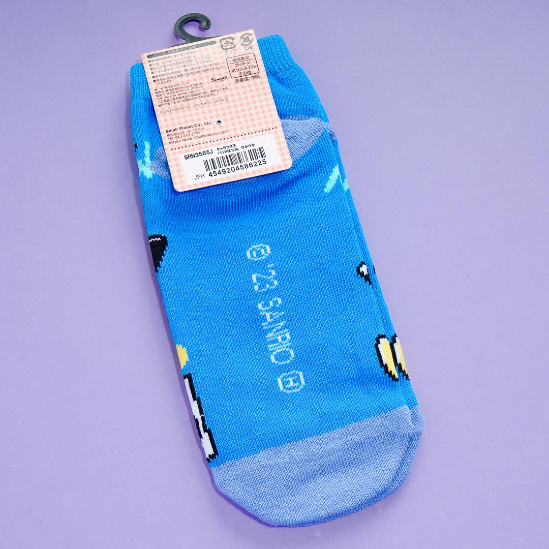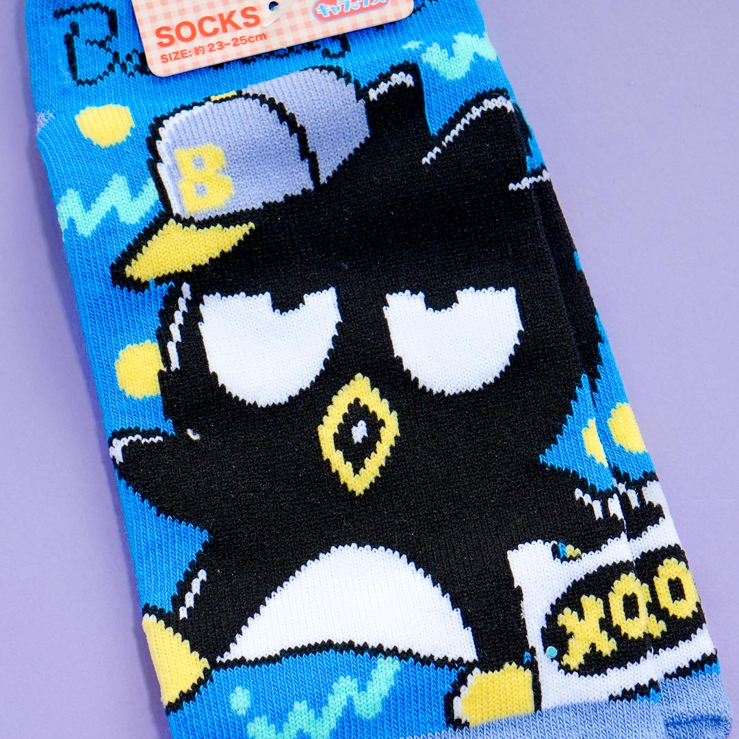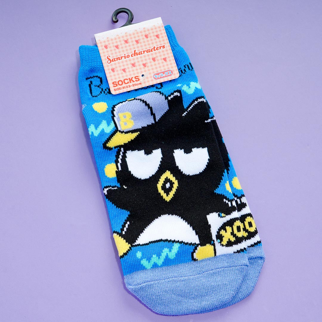 Your feet can look cool and kawaii with this pair of blue ankle-length socks. It is decorated with prints of Bad Badtz-Maru wearing a cute hip-hop cap.