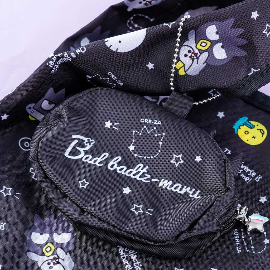 Head down to the supermarket with this super kawaii eco bag covered in prints of Bad Badtz-Maru and his friends playing in space! This eco bag comes with a zippered pouch designed to look like Bad Badtz-Maru's head It has a detachable ball chain. You can store the eco bag inside the pouch when you're not using it.