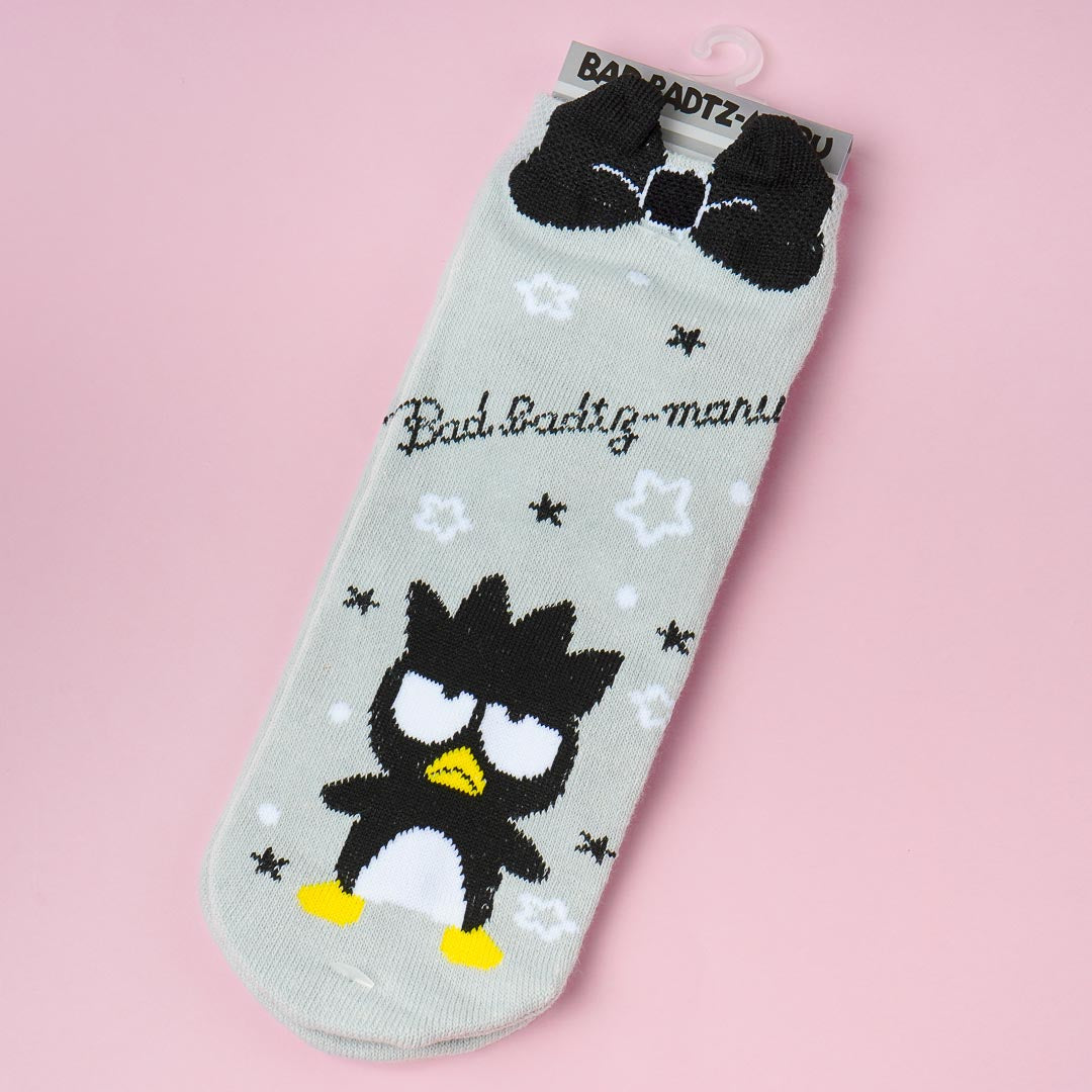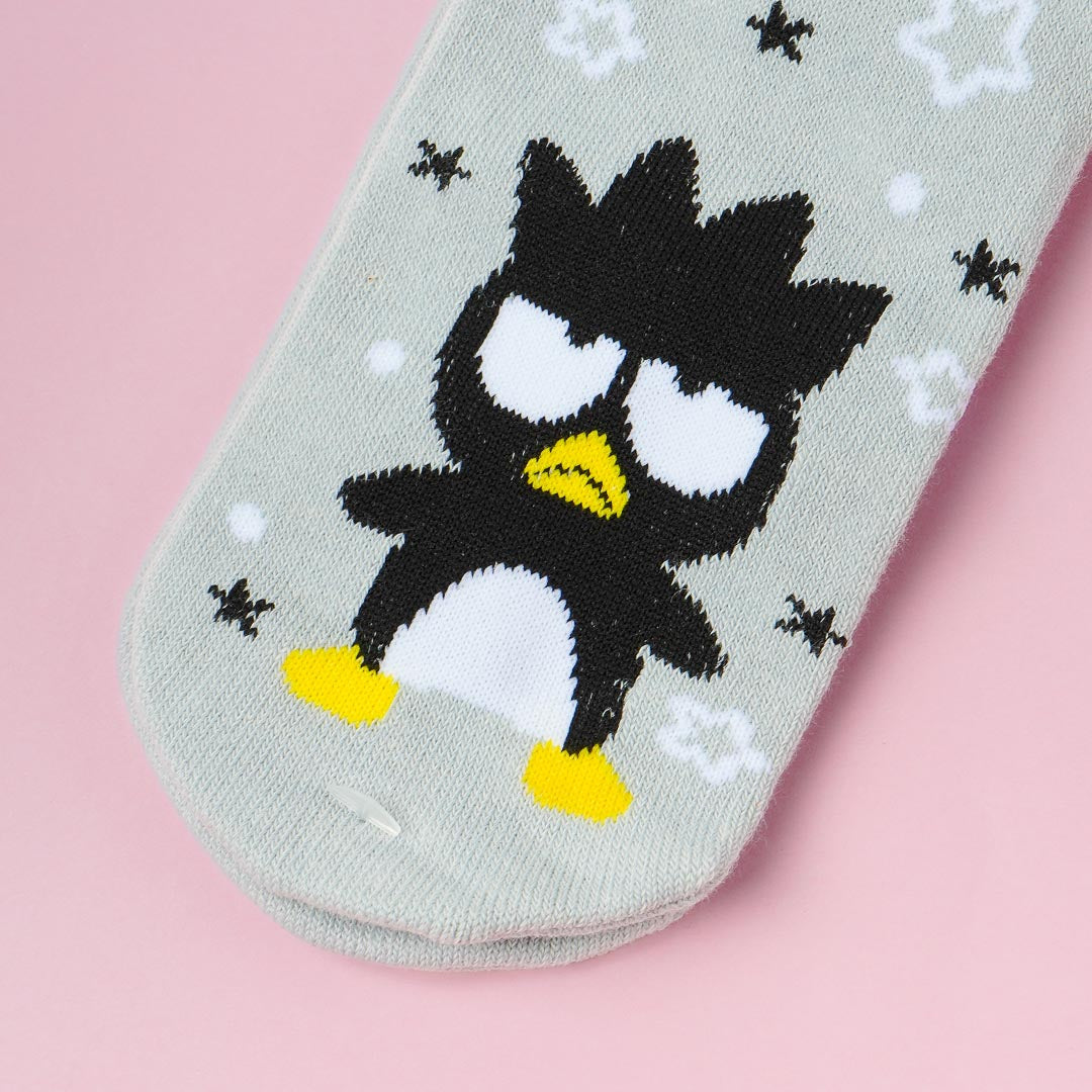 Be comfy and cozy with this pair of kawaii socks! It features a cute print of Bad Badtz-Maru with a starry background and a bowtie on top.