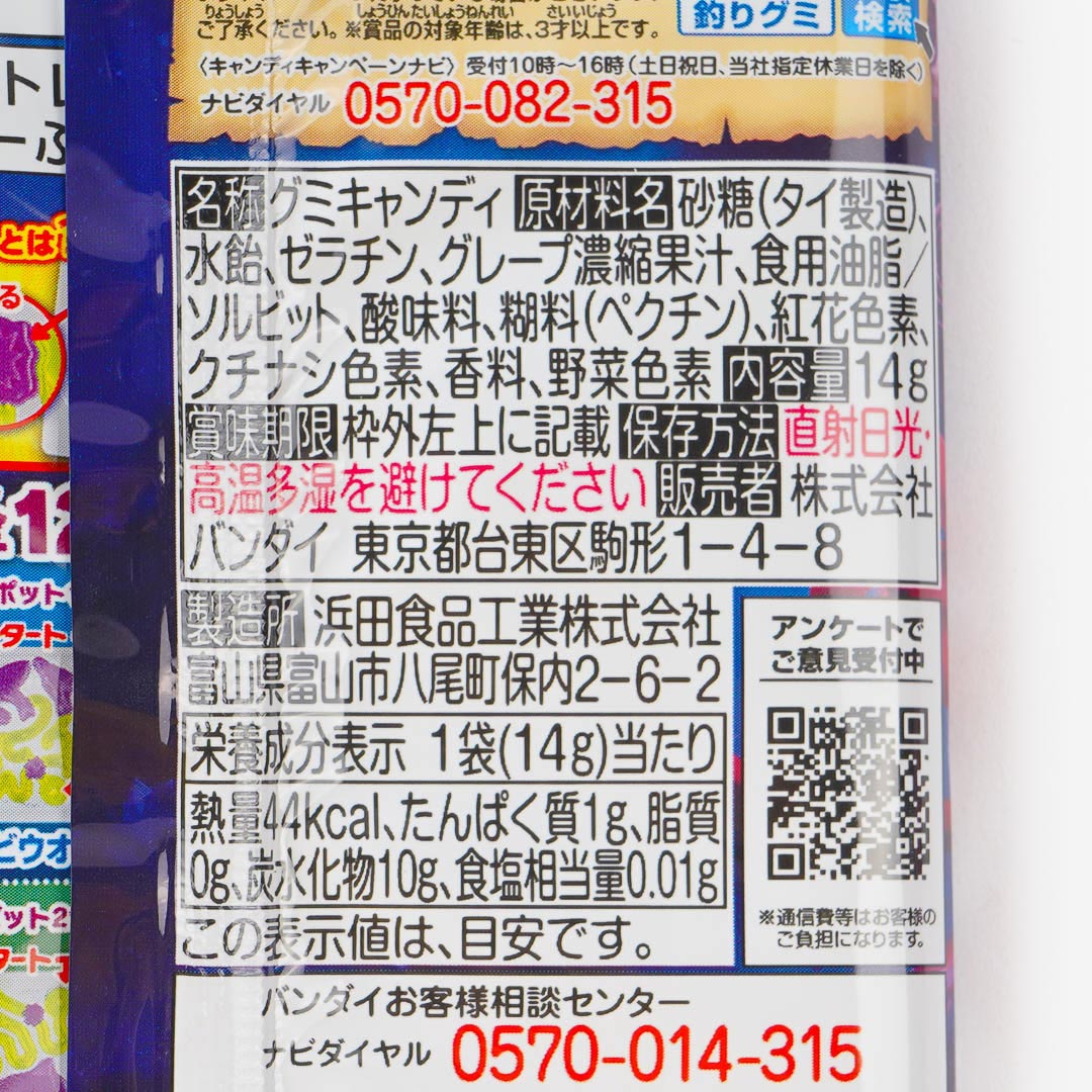 • A pack of grape and melon-flavored gummy candy shaped like a sea creature on a fishing line