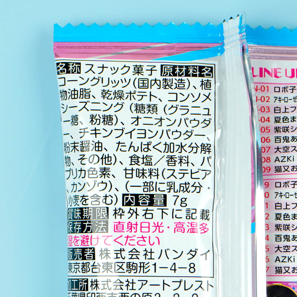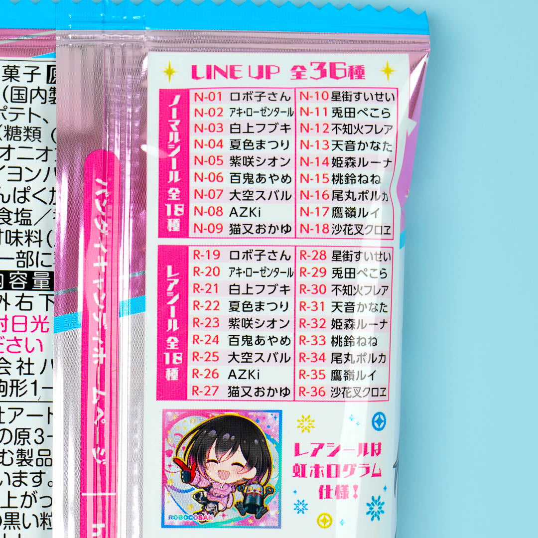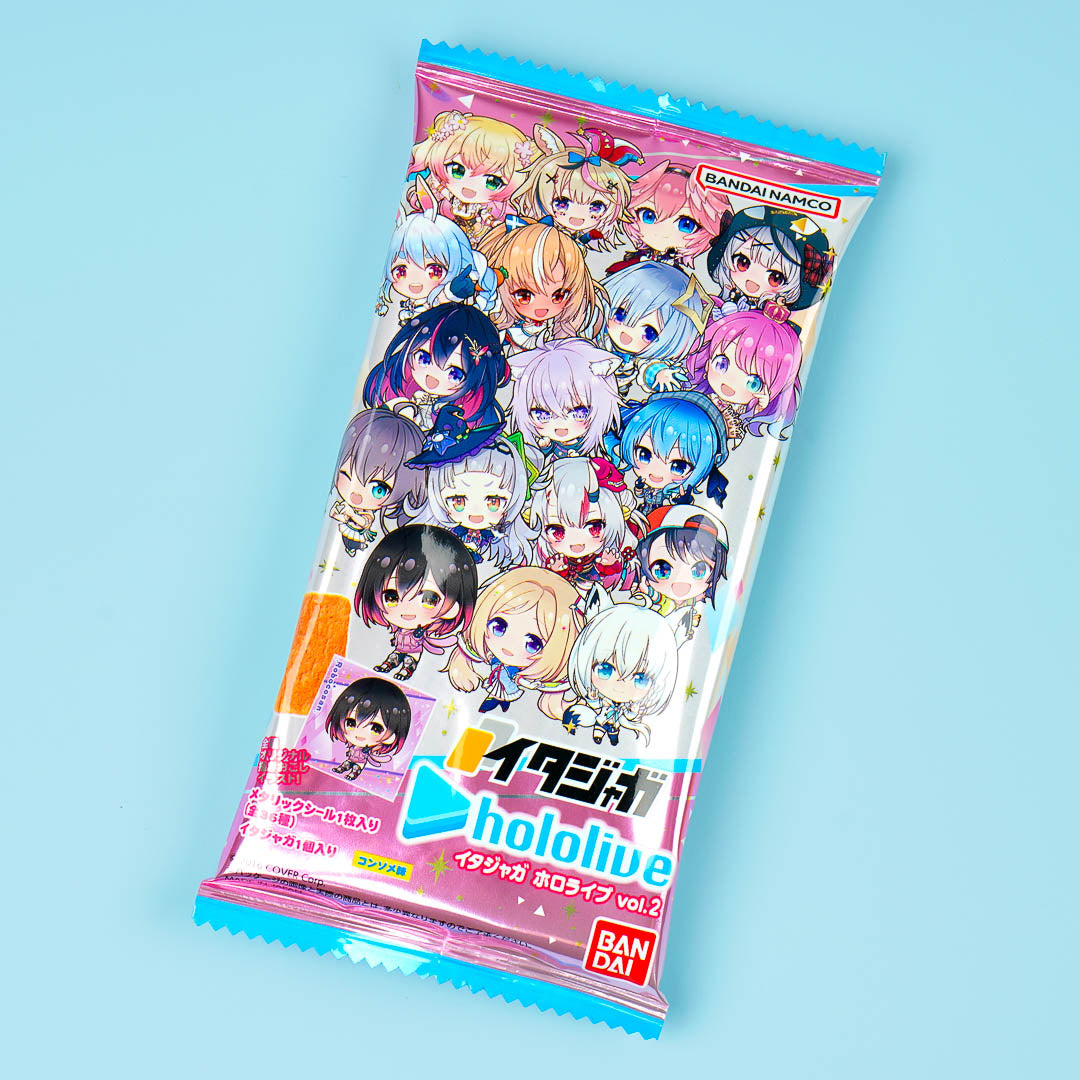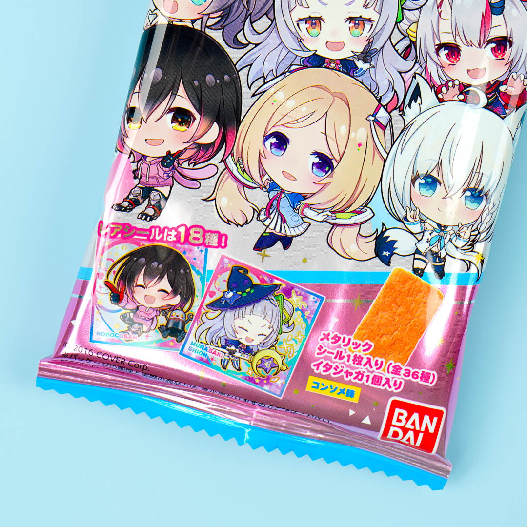 Enjoy munching on a tasty snack while collecting cute stickers! This pack contains a consomme or soup broth-flavored snack and a kawaii sticker featuring the 18 charming members of Hololive.