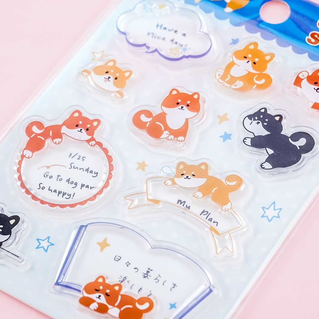 This kawaii sheet of clear stamp stickers features prints of cute Shiba Inu doggies. Use it to glam up your scrapbooking projects! All you have to do is attach the stickers to a flat surface, stamp it on an ink pad, and then decorate away.
