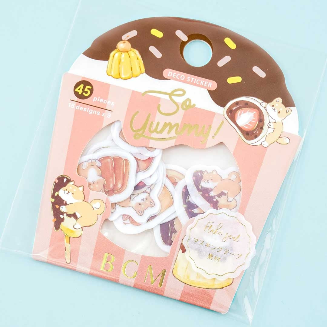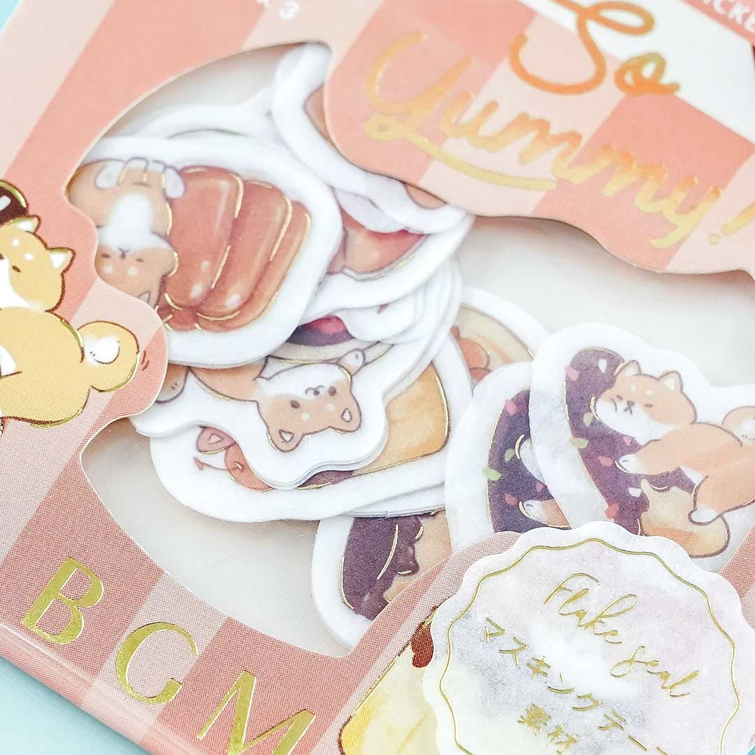 This kawaii pack of die-cut stickers with golden details is perfect for embellishing your cookbook! It features cute Shiba Inu doggies playing with food. Each sticker is made of washi paper!