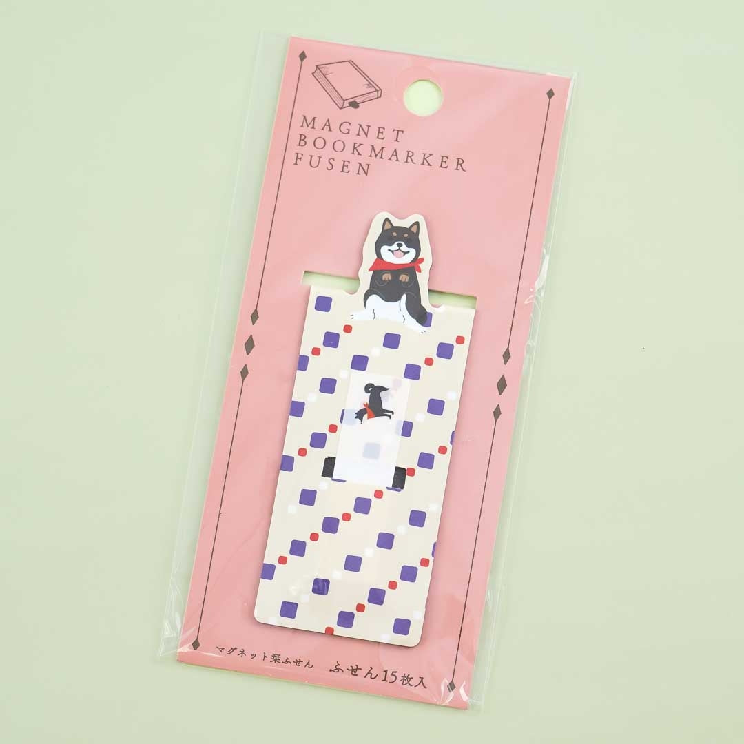 A cute set consisting of a magnet bookmark and sticky tabs with prints of a black Shiba Inu
