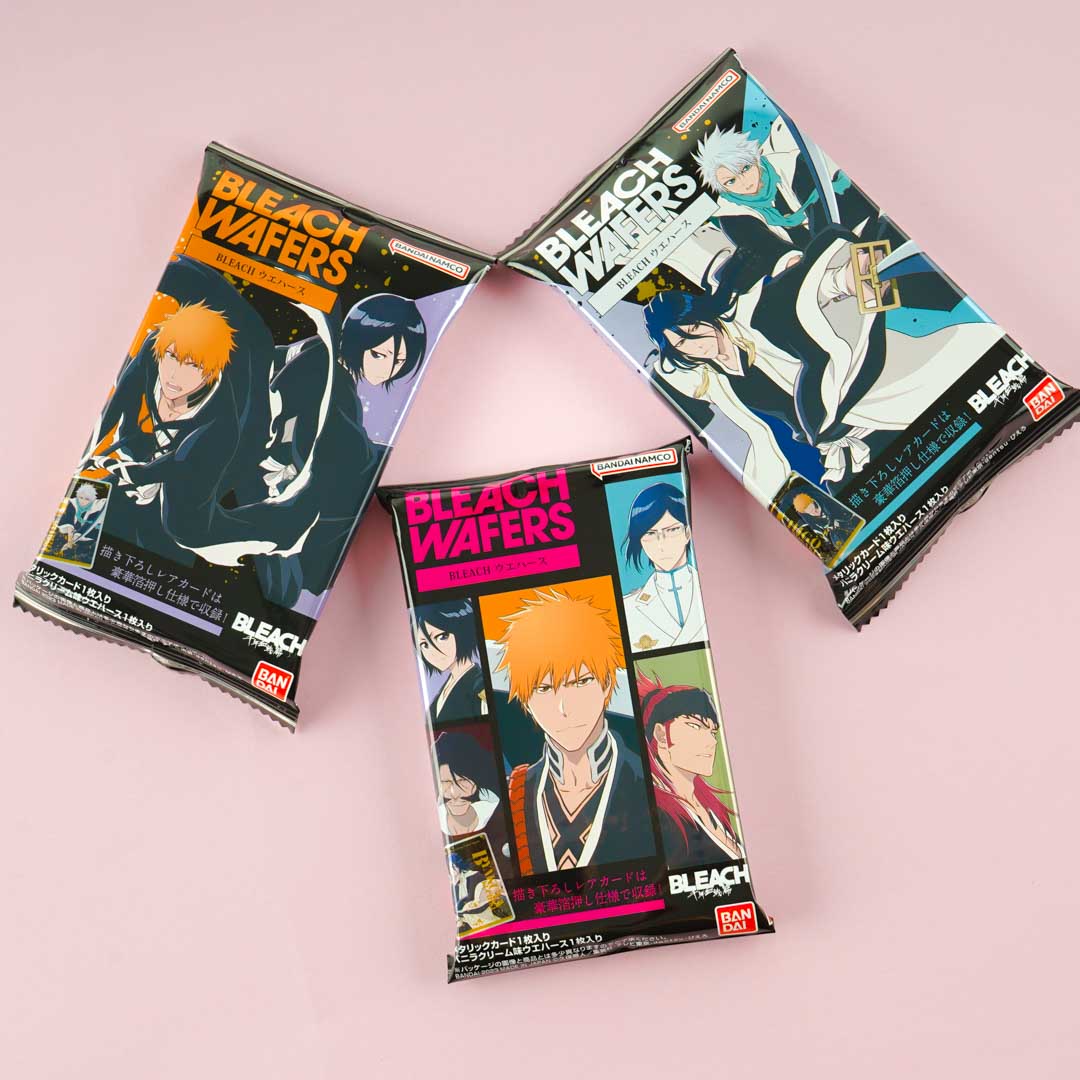 Snack on this sweet vanilla cream-flavored wafer! It also comes with a set of metallic cards that features characters from the last arc of the iconic BLEACH animated action series called “BLEACH Thousand-Year Blood War.”