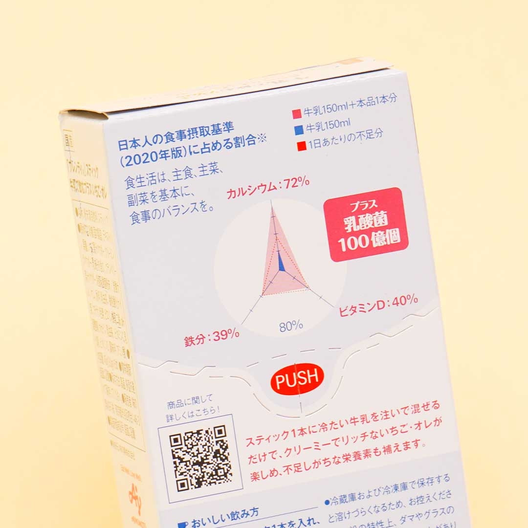 Use one stick and dissolve it in cold milk to make a sweet strawberry milk drink! Each packet in the box contains beneficial calcium, lactic acid bacteria, and iron — making it a healthy and fruity beverage.