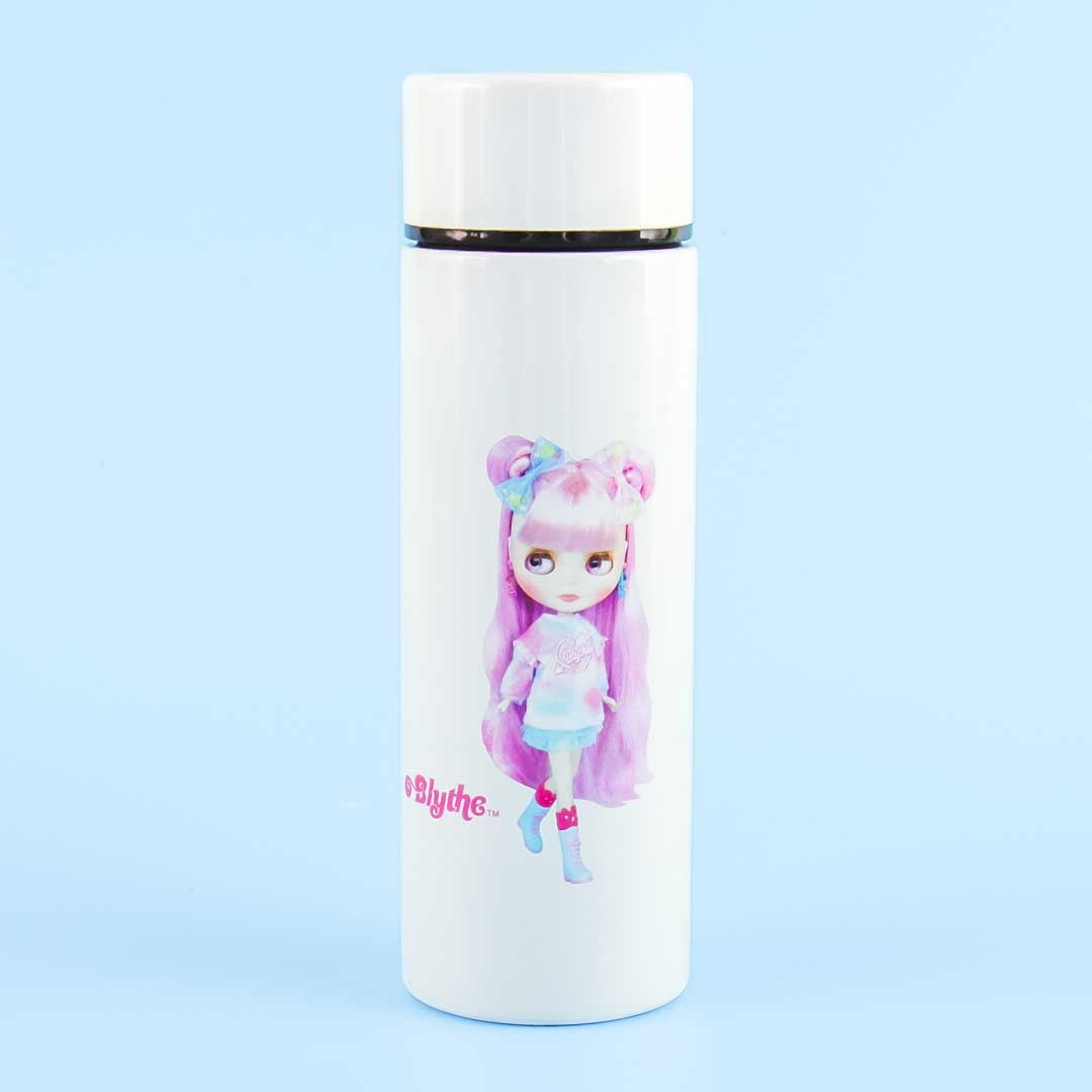 Carry your favorite drink around using this super cute white stainless steel bottle! It features a print of a Blythe doll in a cute cosmic pink dress. This bottle can keep your drinks hot or cold for more or less six hours!